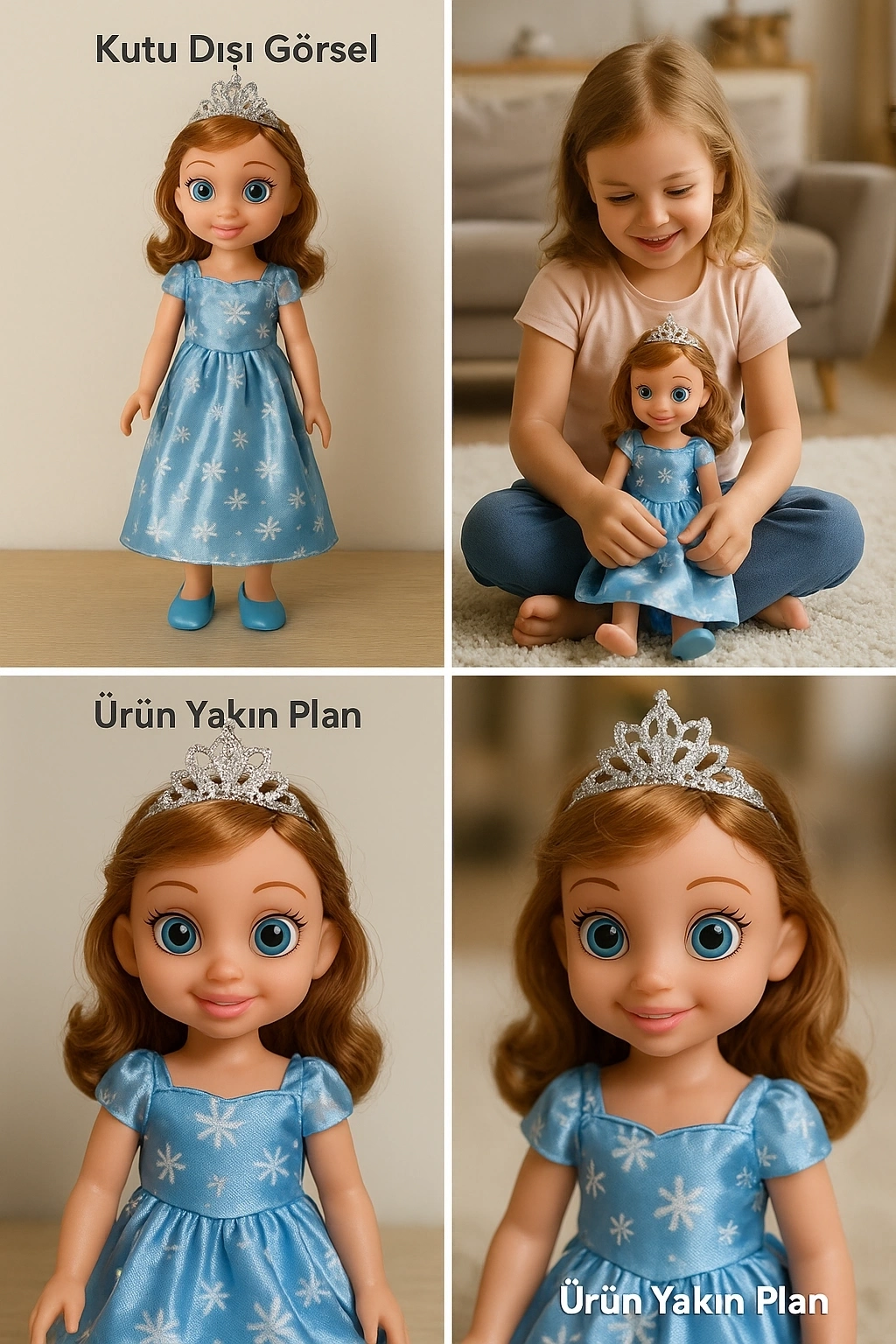 ✔️ Prenses temalı tasarım – Parıltılı mavi elbisesi ve zarif tacıyla göz alıcı bir görünüme sahip.
