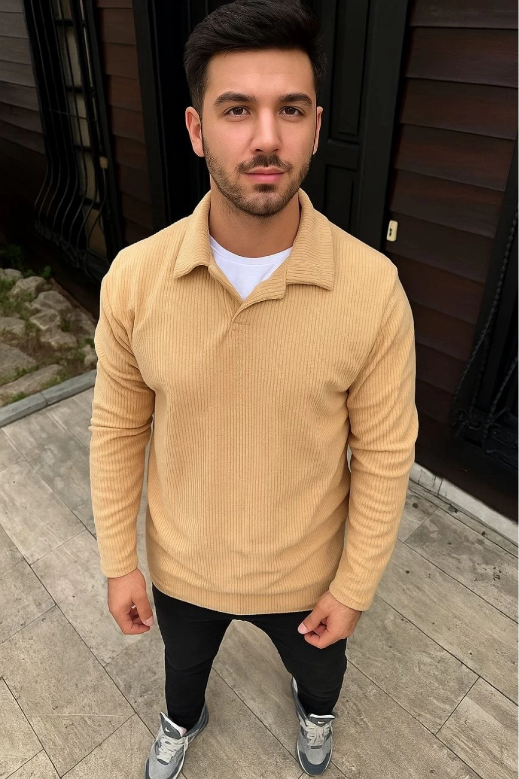 Fitilli Polar Sweatshirt – Düğmesiz Polo Yaka, Oversize Rahat Kalıp, Kalın Polar Kumaş, Kışlık ve Baharlık Şık Günlük Üst - Bej