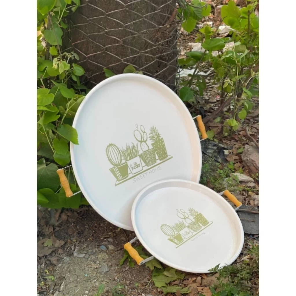 İKİLİ YUVARLAK SUNUM TEPSİSİ SETİÜrün ÖzellikleriBüyük boy tepsinin çapı 51 cm, küçük boy tepsinin çapı ise 37 cm'dir. Bu şık ikili tepsi seti, yuvarlak formu ve estetik tasarımıyla mükemmel bir sunum aracıdır. Ahşap tutma kulpları sayesinde rahatlıkla taşınabilir. Hem işlevsel hem de dekoratif olarak kullanılabilir. Evde misafir ağırlarken, kahve saati sunumları veya yemek servisleri için ideal bir seçenektir. Modern tarzı ve pratikliğiyle her evde yerini alacak.Paket İçeriği1 Adet İkili Yuvarlak Sunum Tepsisi Seti