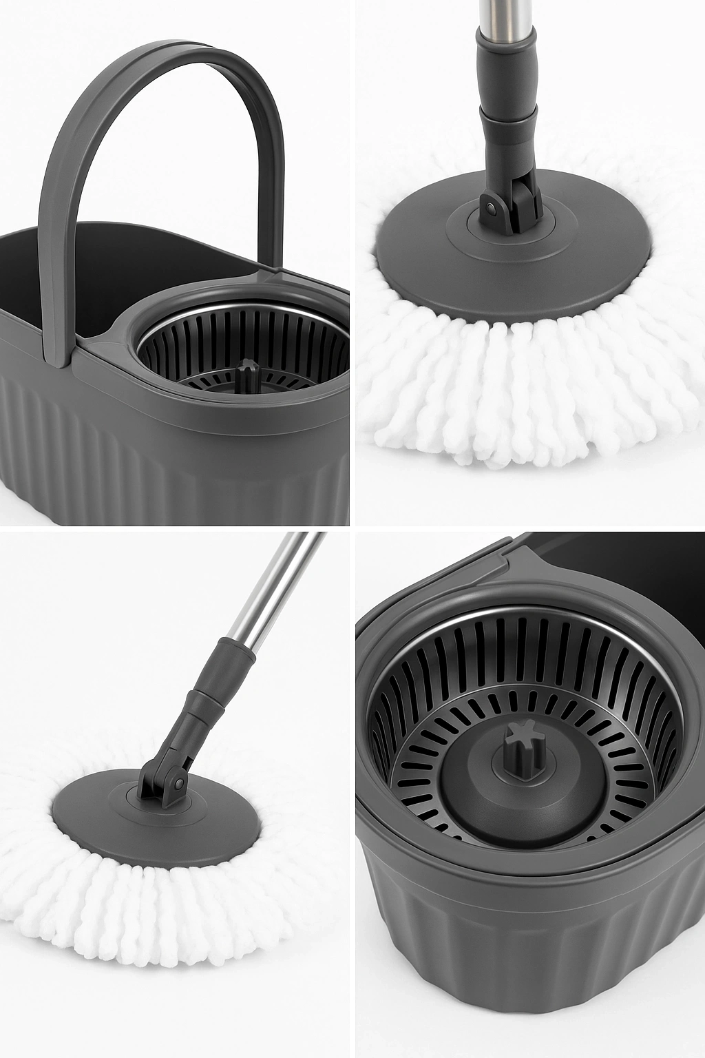 Otomatik Mop Seti Paspas ve Sıkma Kovası, 360° Döner Başlıklı Mikrofiber Yer Temizleme Gri