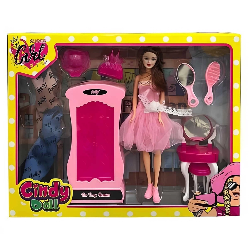 Setin içerisinde; Cindy bebek, 2 adet elbise, şapka, aynalı makyaj masası, gardırop, tarak, ayna ve çanta yer almaktadır.