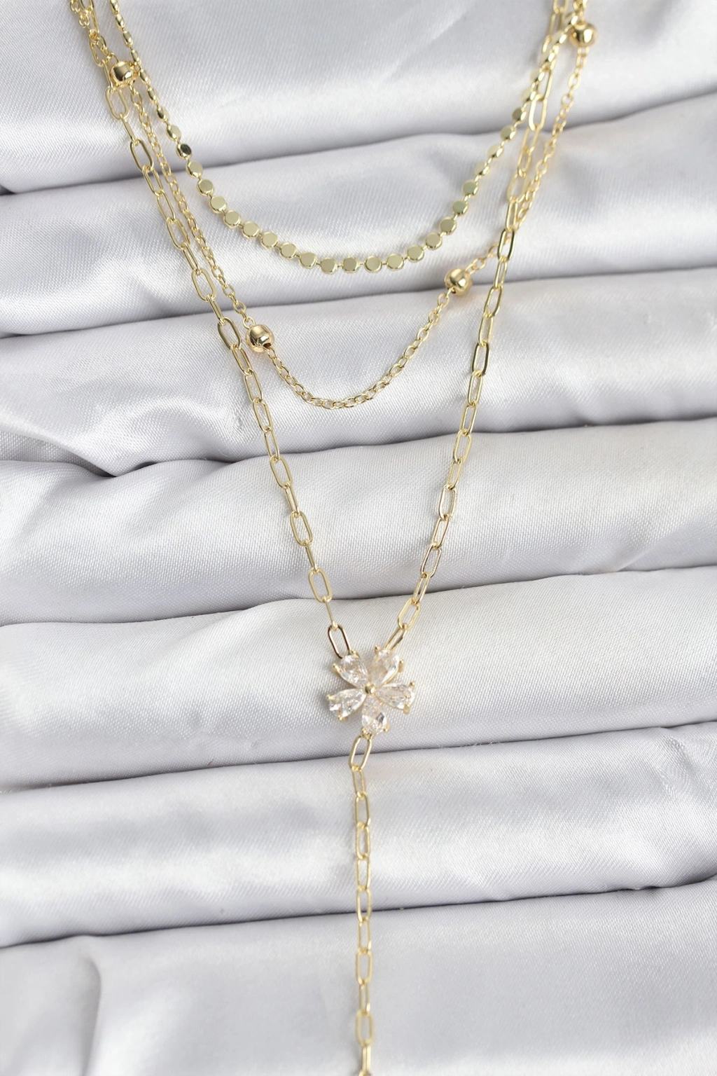 Pirinç Gold Renk Zirkon Taşlı Çiçek Model Detaylı 3'lü Kombin Y Kadın Kolye