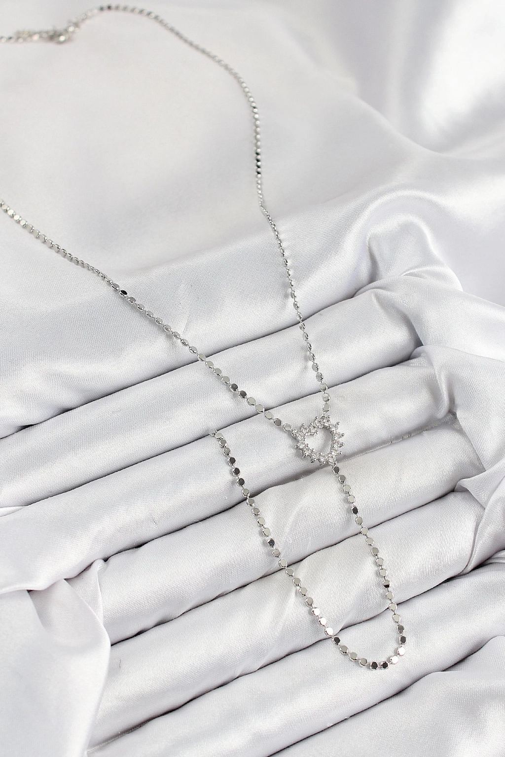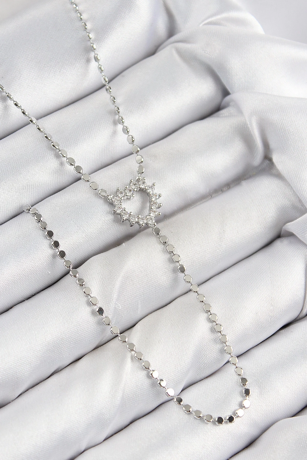 ÇOK SATAN Pirinç Zirkon Taşlı Ezme Zincirli Kalp Model Gümüş Renk Y Kolye