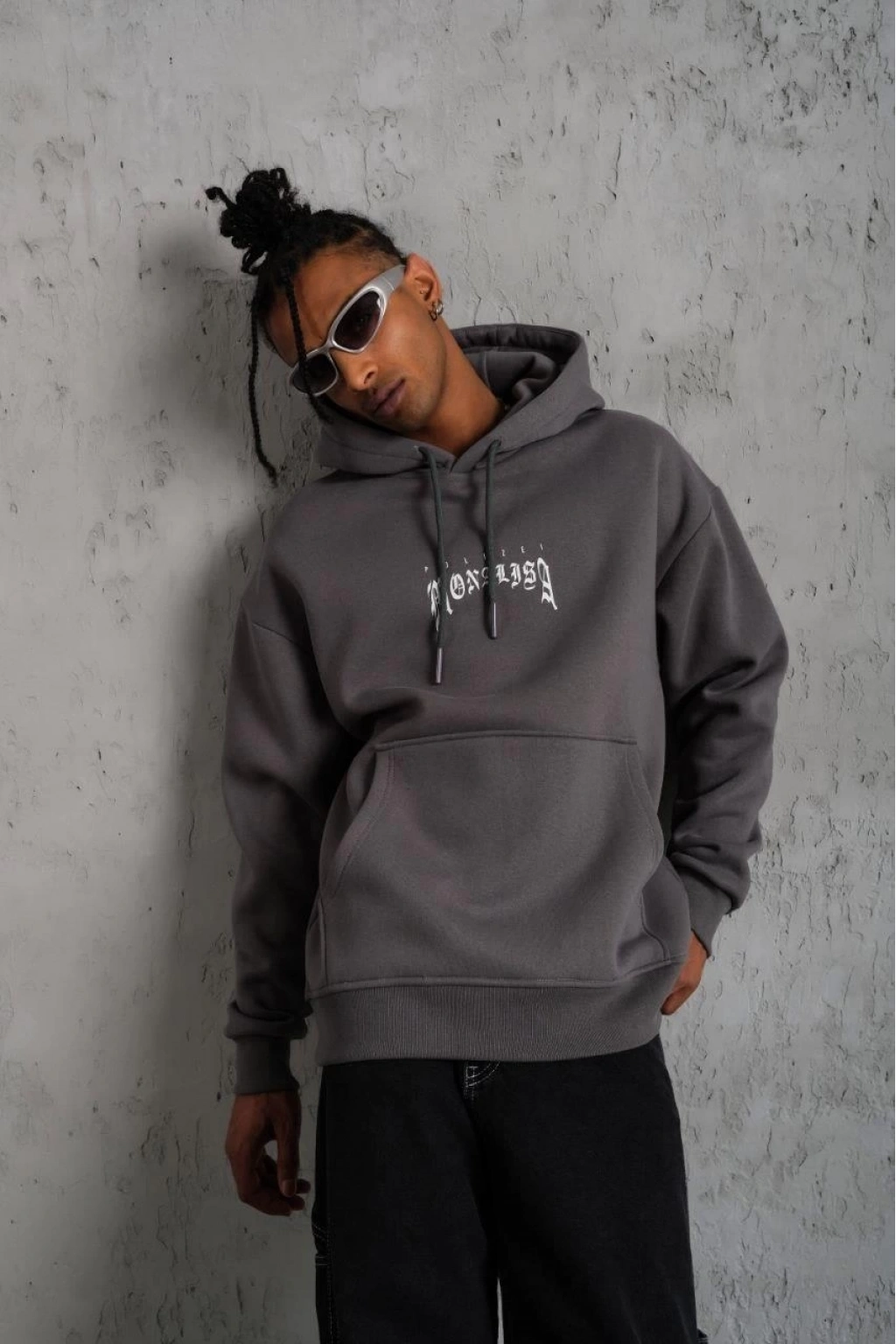 Baskılı Kapüşonlu ve Kanguru Cepli Sweat- Gri