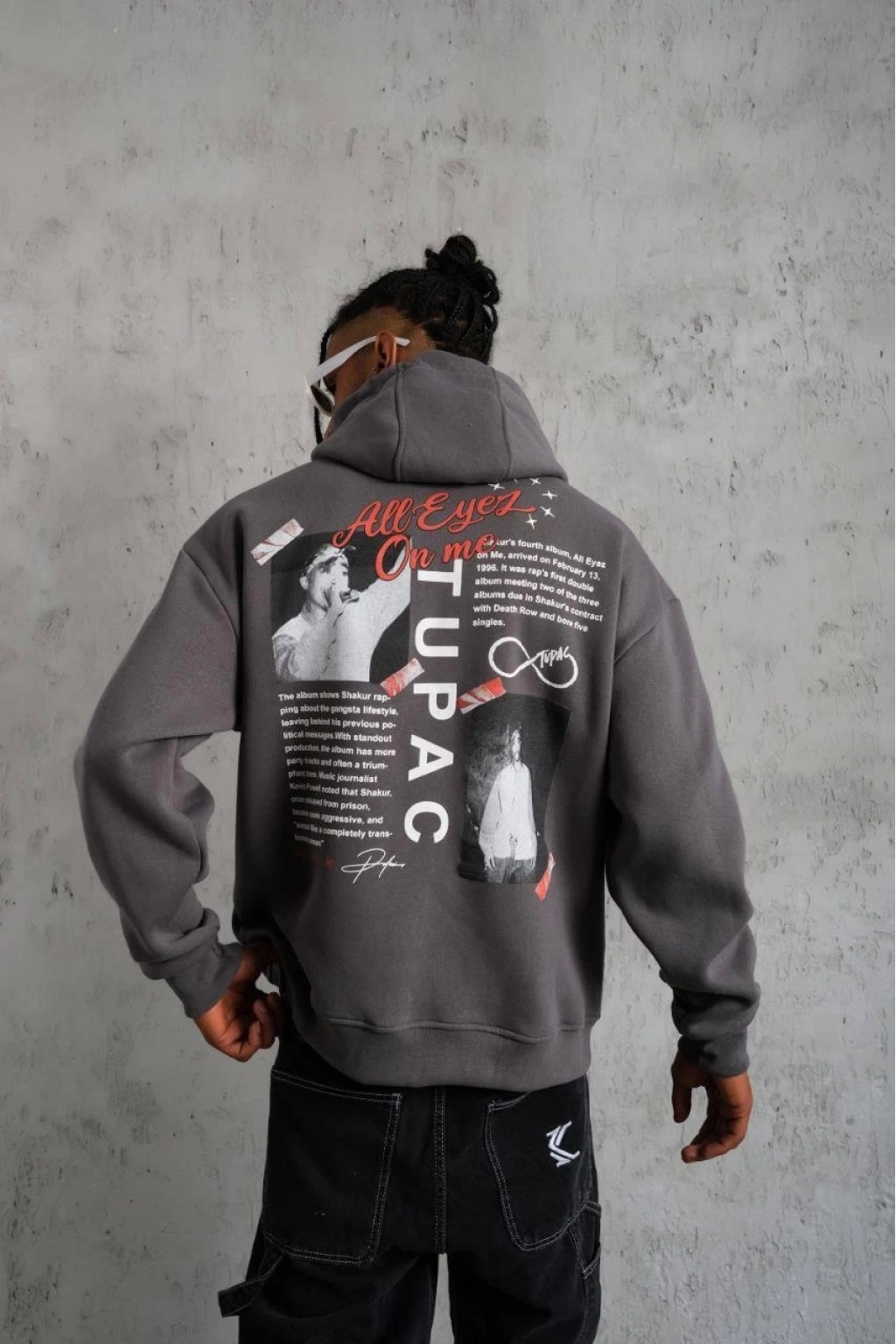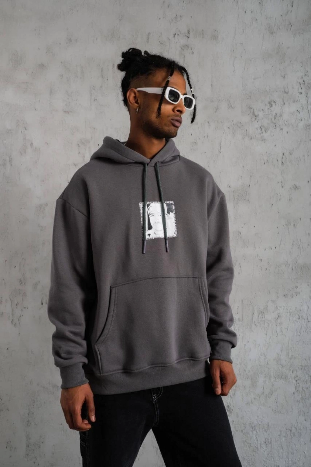 Ön Arka Baskılı Kapşonlu Sweat - Gri