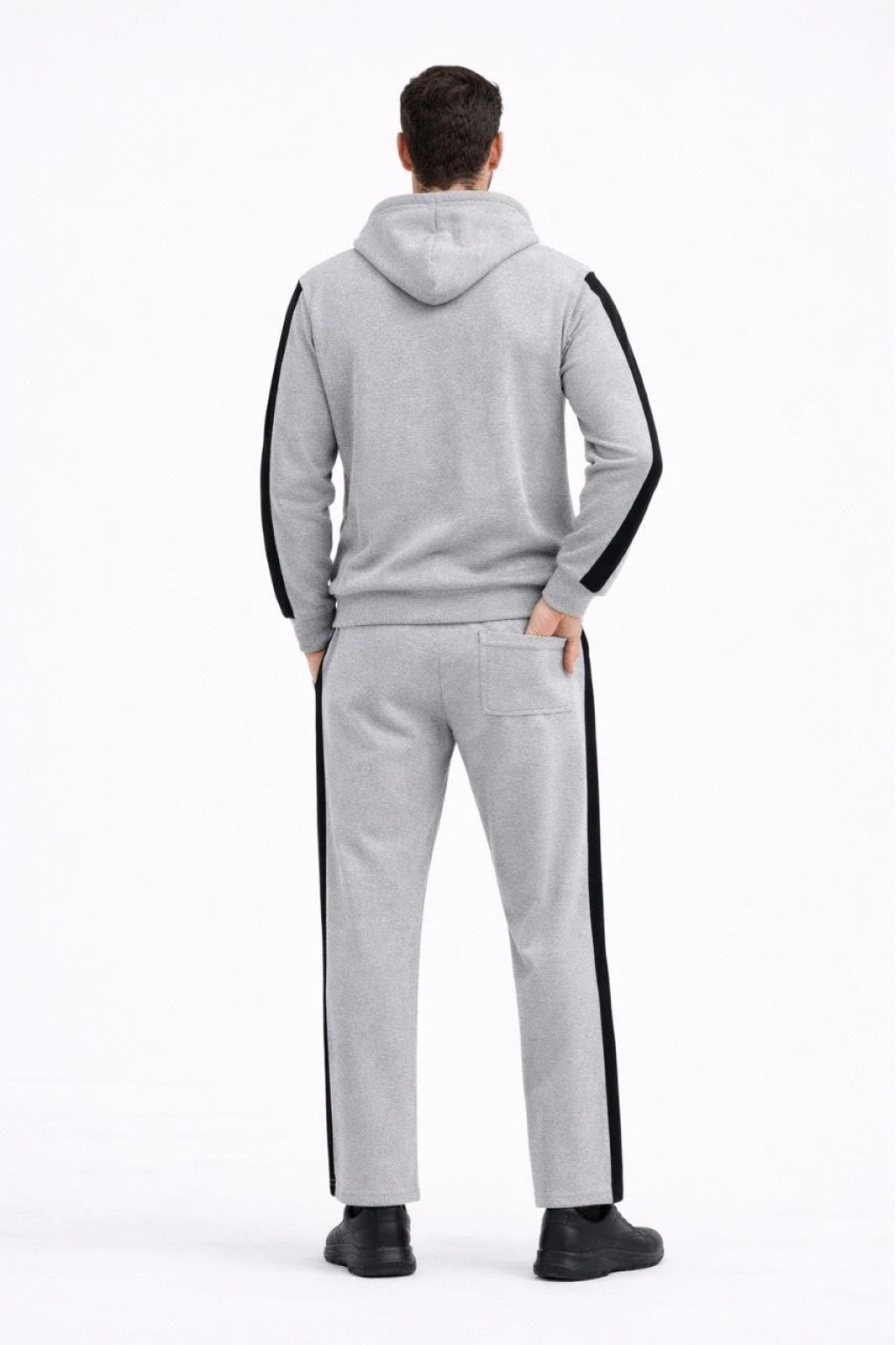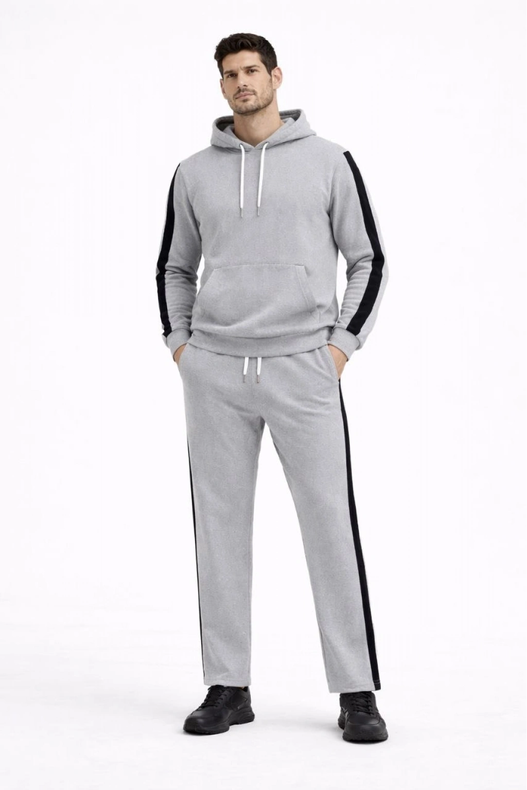 Şeritli Eşofman Takım Kapüşonlu Sweatshirt Boru Paça Alt, Oversize 3 iplik Pamuklu - Gri