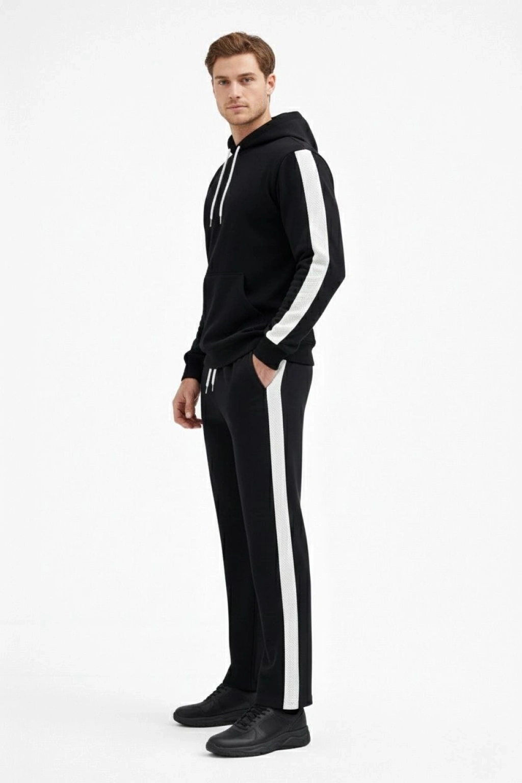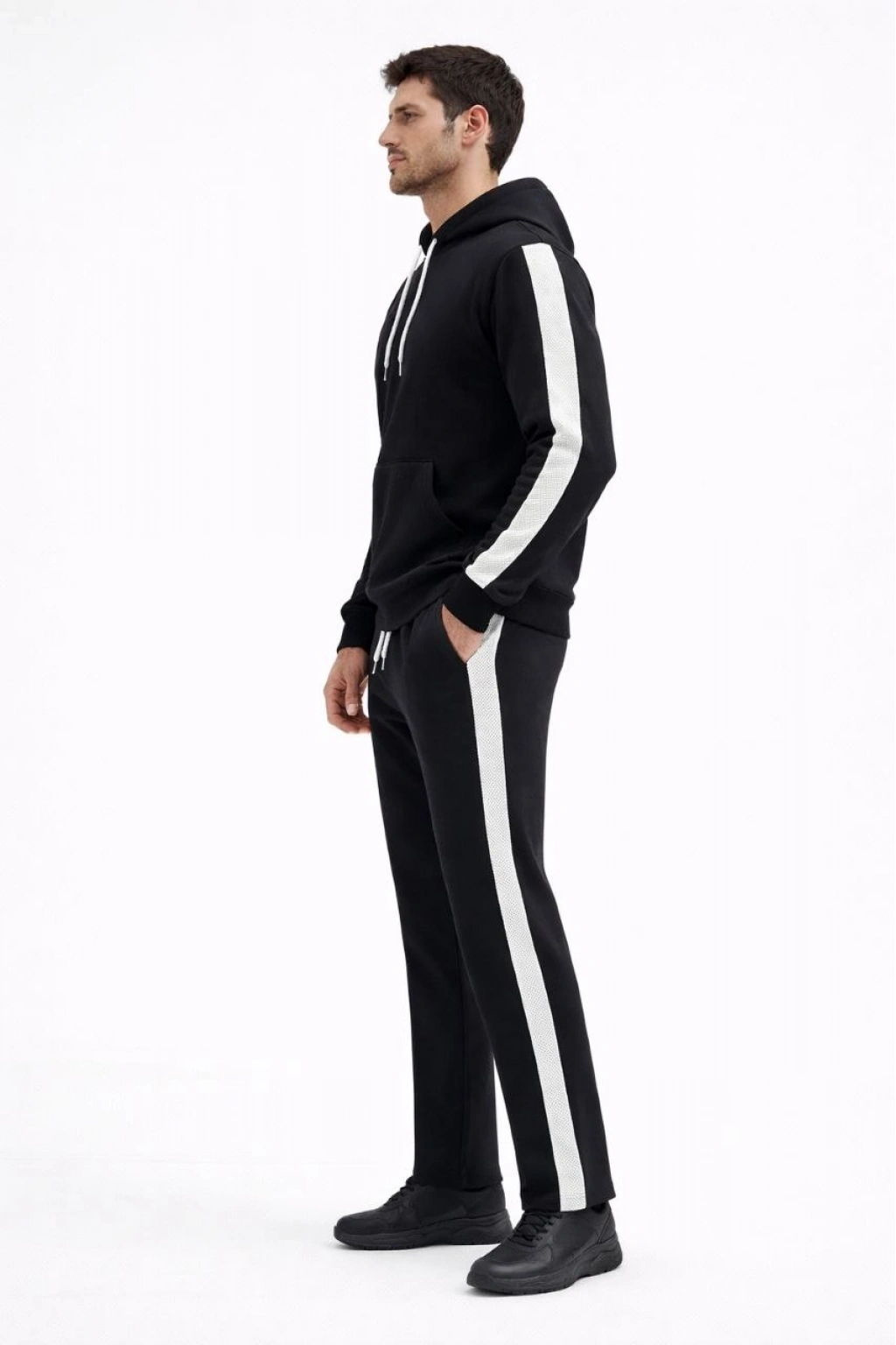 Şeritli Eşofman Takım Kapüşonlu Sweatshirt Boru Paça Alt, Oversize 3 iplik Pamuklu - Siyah
