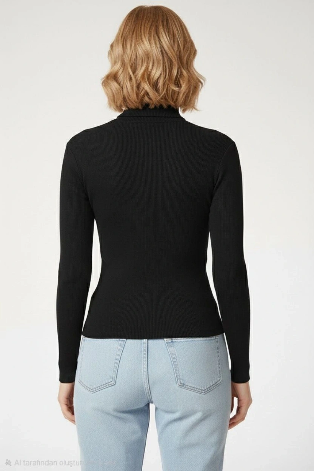 Tam Boğazlı Fitilli Likrali Kaşkorse Badi İnce Uzun Kollu Kazak - Siyah