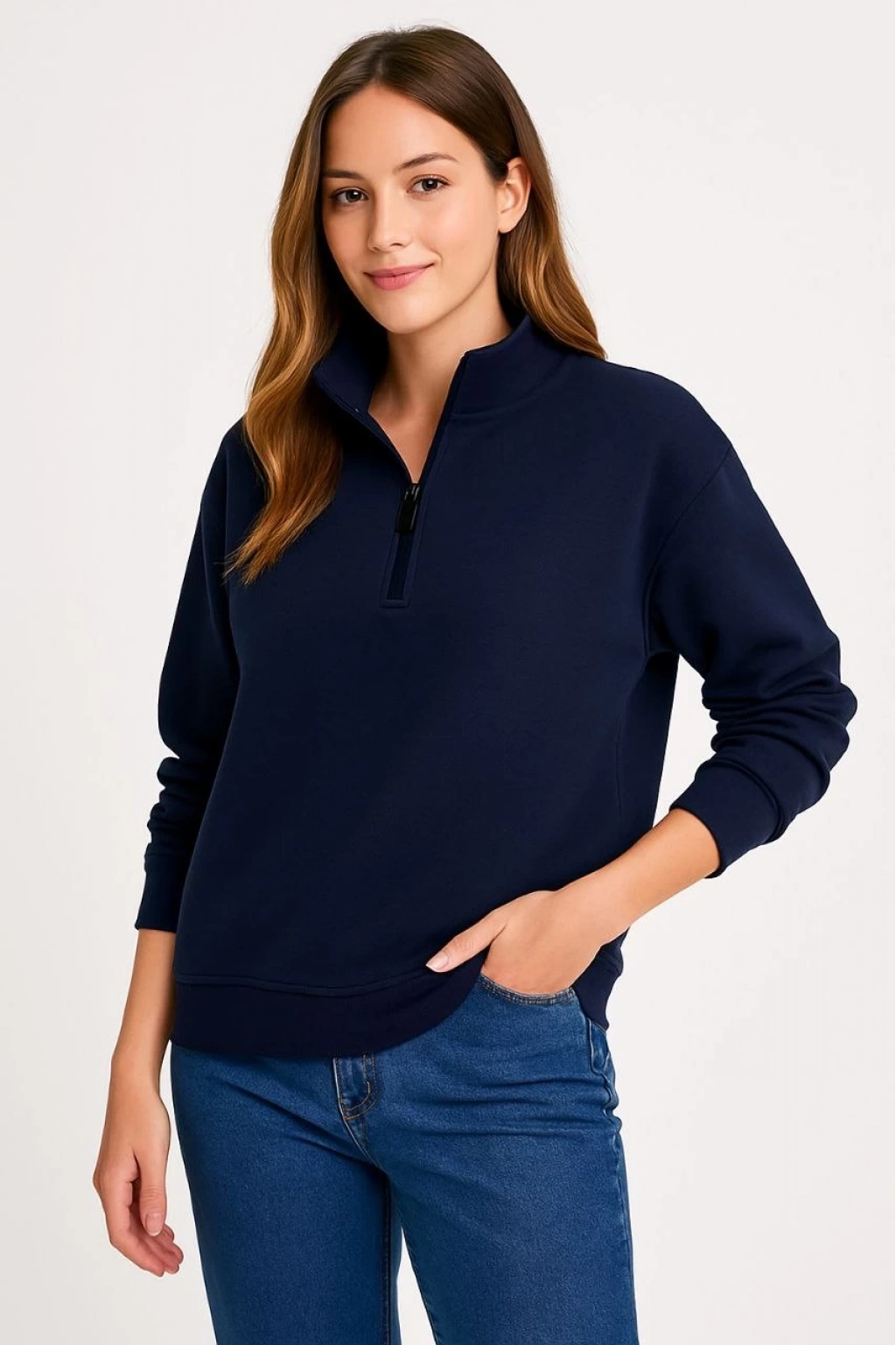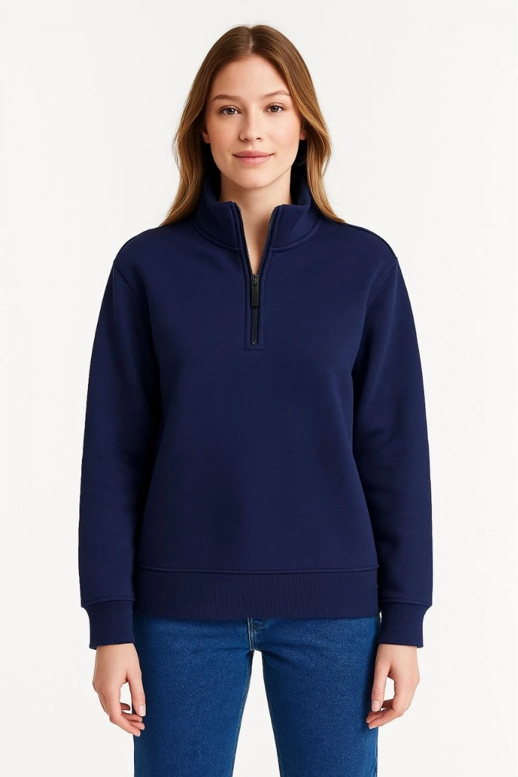 Üç İplik Dık Yaka Yarım Fermuarlı SweatShirt - Lacivert