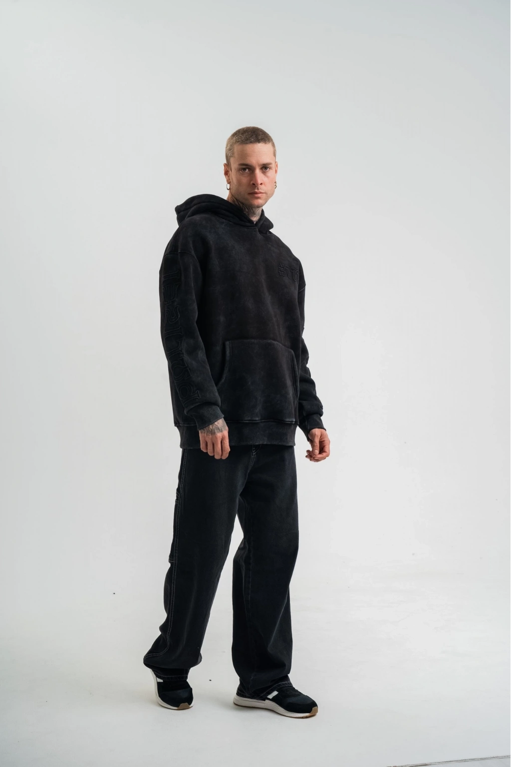 Uzun Kol Kapşonlu Yıkamalı Nakışlı SweatShirt - Siyah