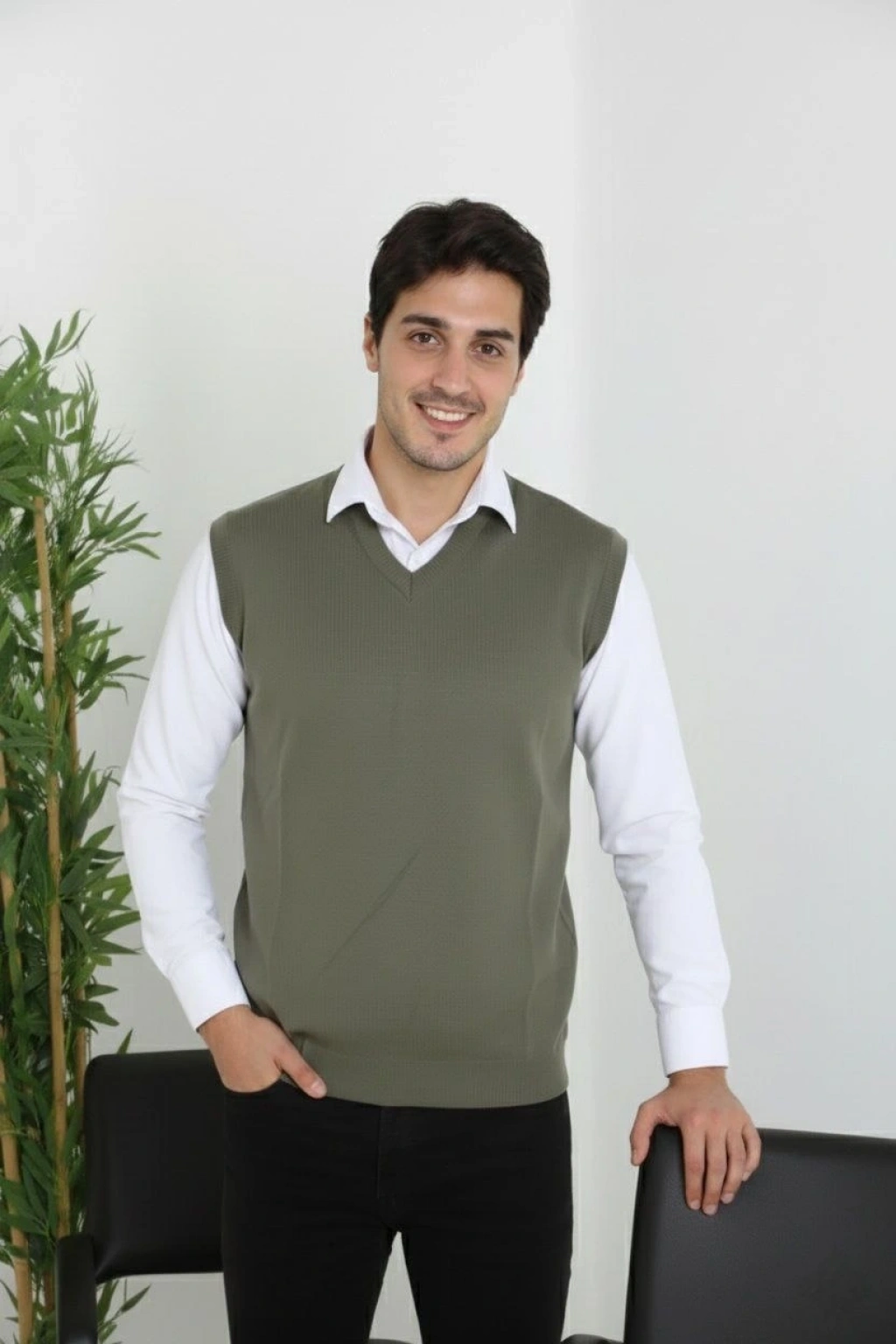 V Yaka Kolsuz Süveter Triko Kazak yumuşak dokulu Pamuklu ince Dokuma Rahat Regular kalıp - Haki