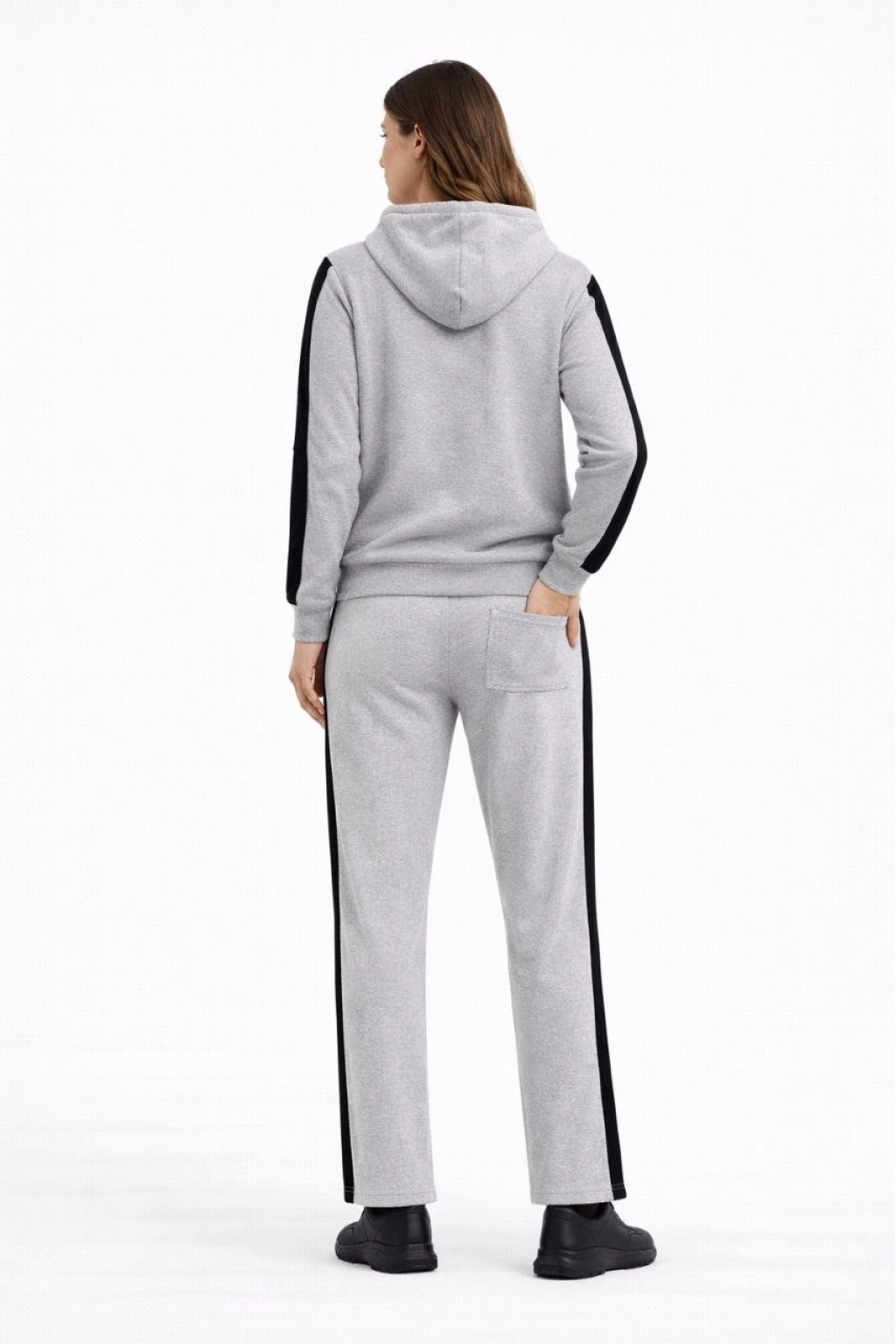 Yandan Şeritli Eşofman Takım Kapüşonlu Sweatshirt Boru Paça Alt, Oversize 3 iplik Pamuklu - Gri