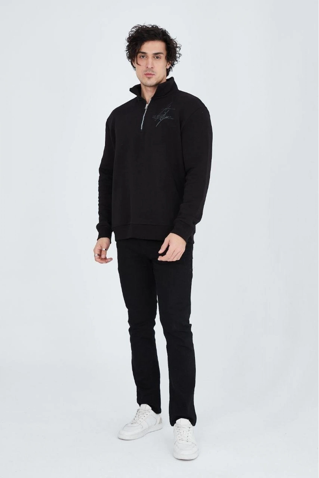 Yarım Fermuarlı Baskılı Sweat - Siyah