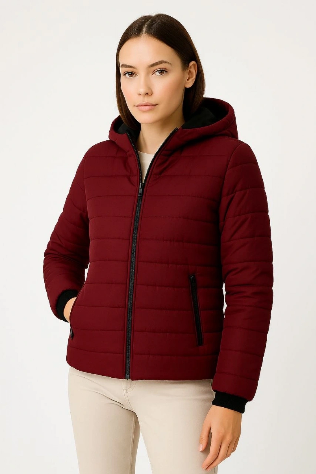 Şişme Kapüşonlu Fermuarlı Mont Su itici Kapitone Astarlı Kumaş Cepli Kışlık Rahat Kalıp - Bordo