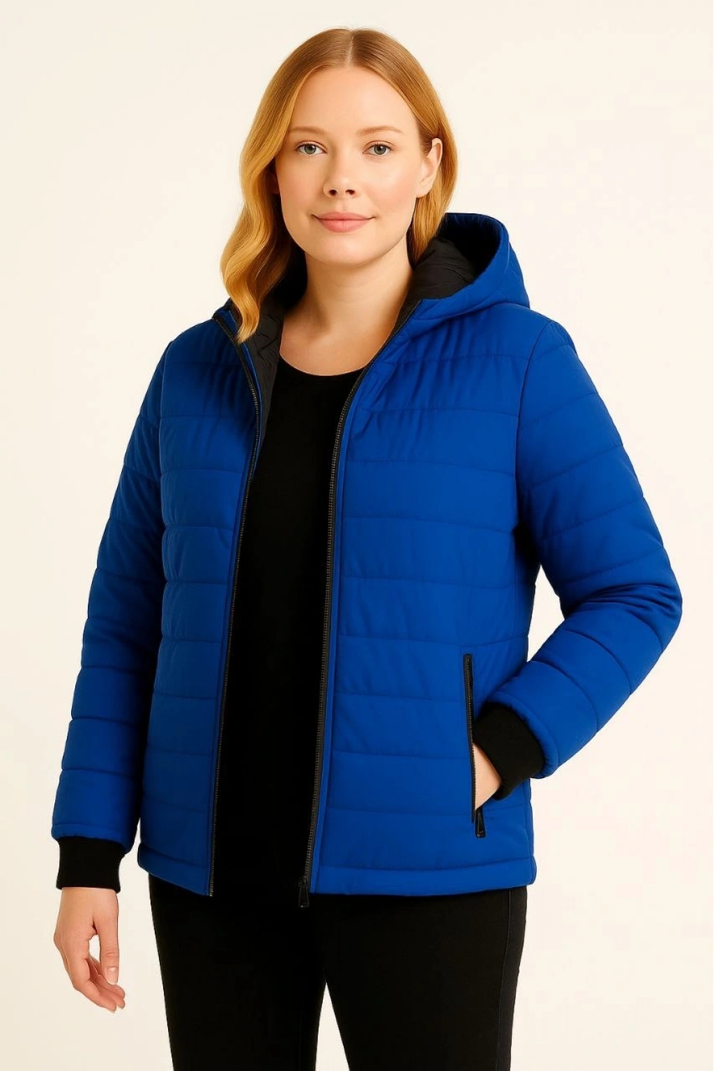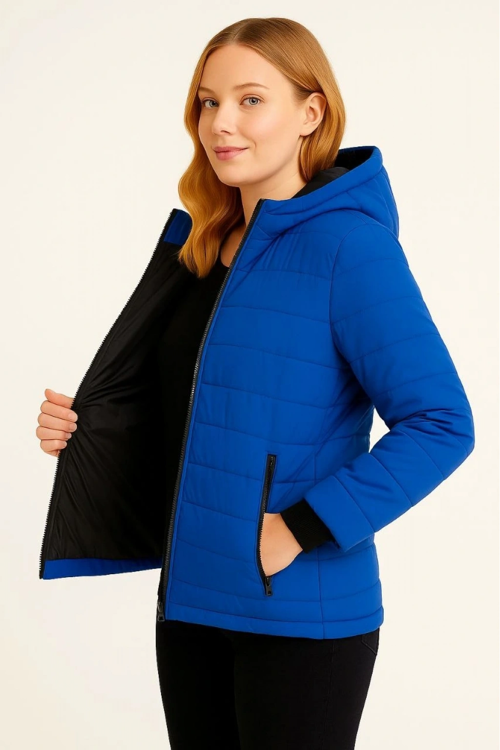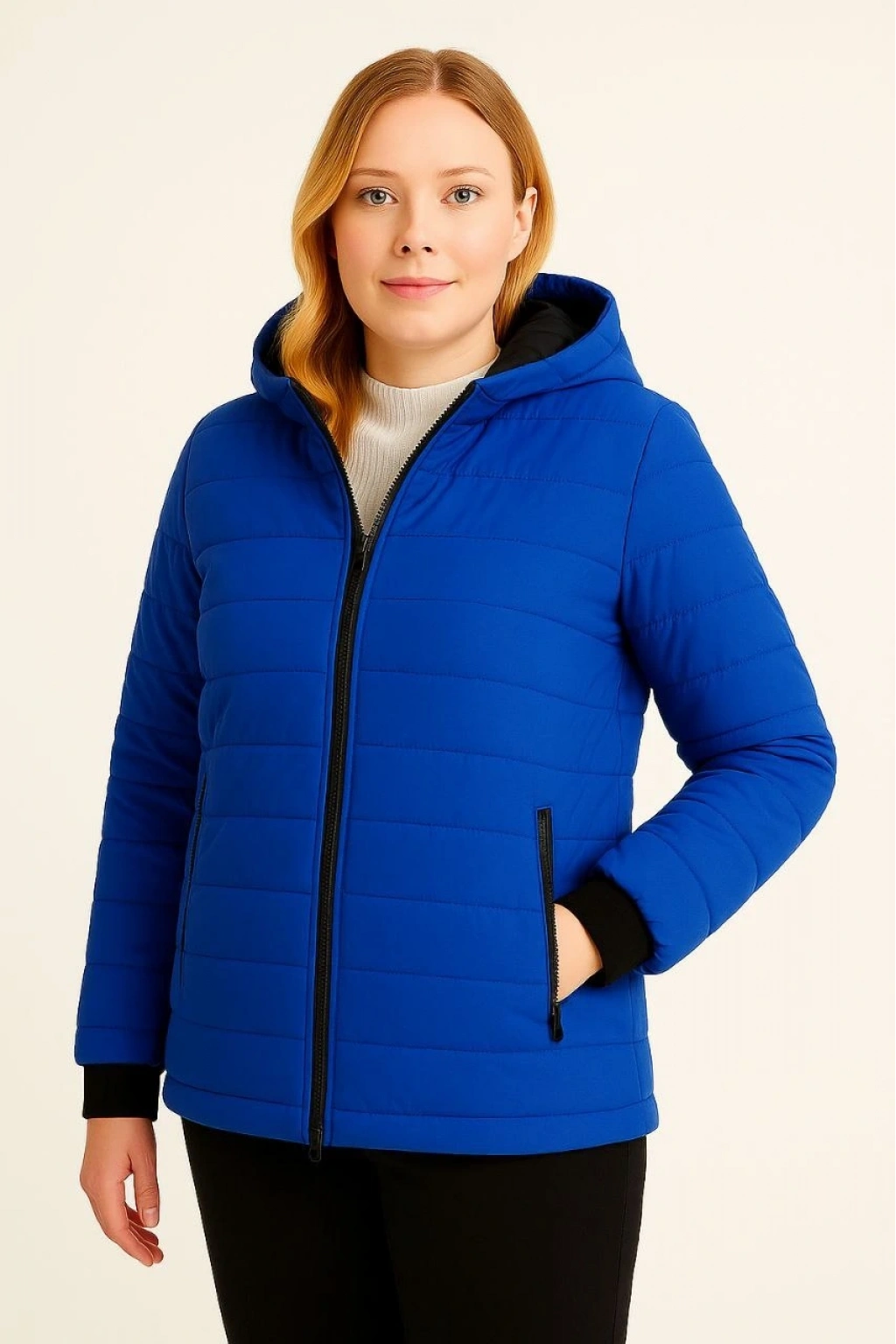 Şişme Kapüşonlu Fermuarlı Mont Su itici Kapitone Astarlı Kumaş Cepli Kışlık Rahat Kalıp - Saks Mavisi