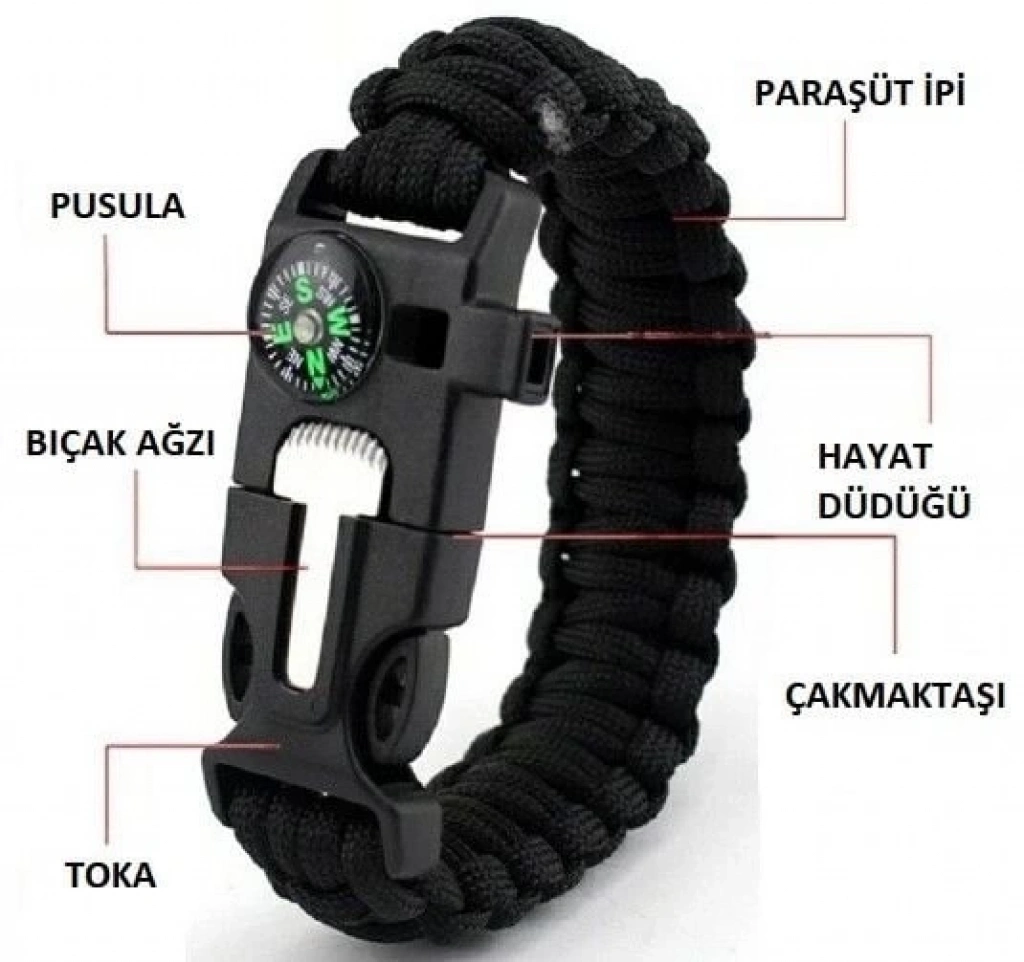 Bileklik hayat kurtarıcı, acil bir durumda kullanılabilen düdük, çakı, çakmaktaşı, pusula ve paraşüt ipi olarak kullanıma uygundur.