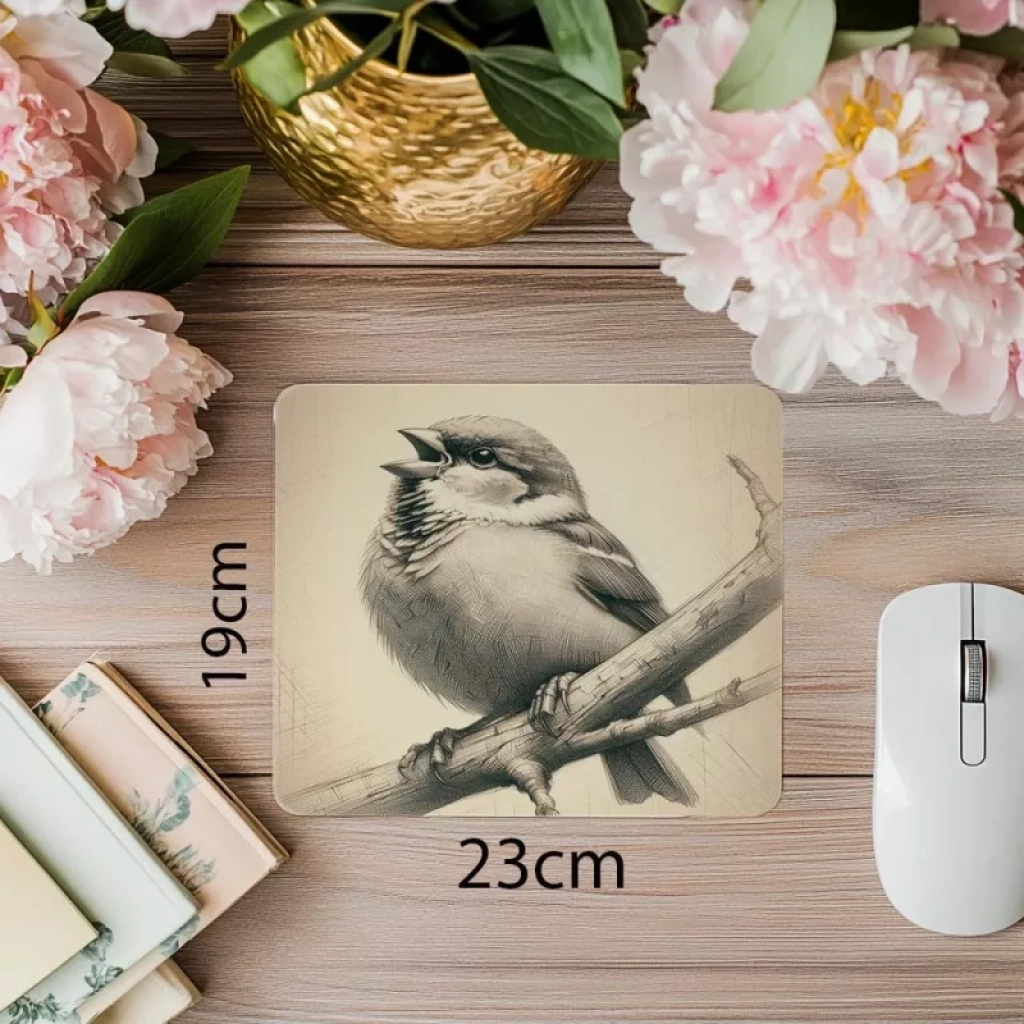 Dalda oturan serçe çizimli mousepad – minimal tarzıyla masanda sadelik ve şıklığı yakala! İnce detaylar ve rahat yüzeyiyle oyun ve çalışma keyfini artır.