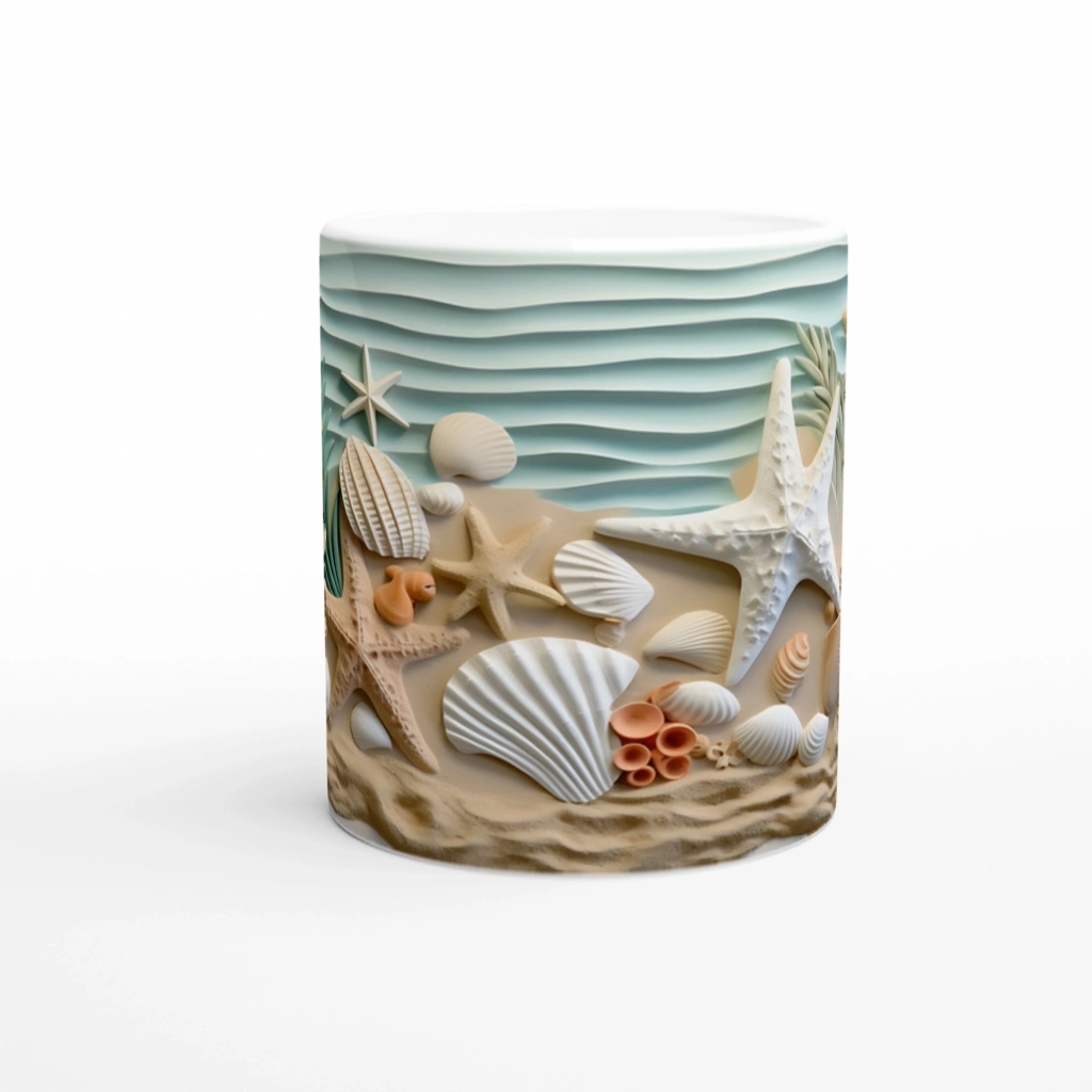 Deniz kabukları, yıldızlar ve yeşil bitki dokunuşlarıyla süslenen bu kupa bardak, yaz ruhunu evinize taşıyacak özel bir tasarımdır.