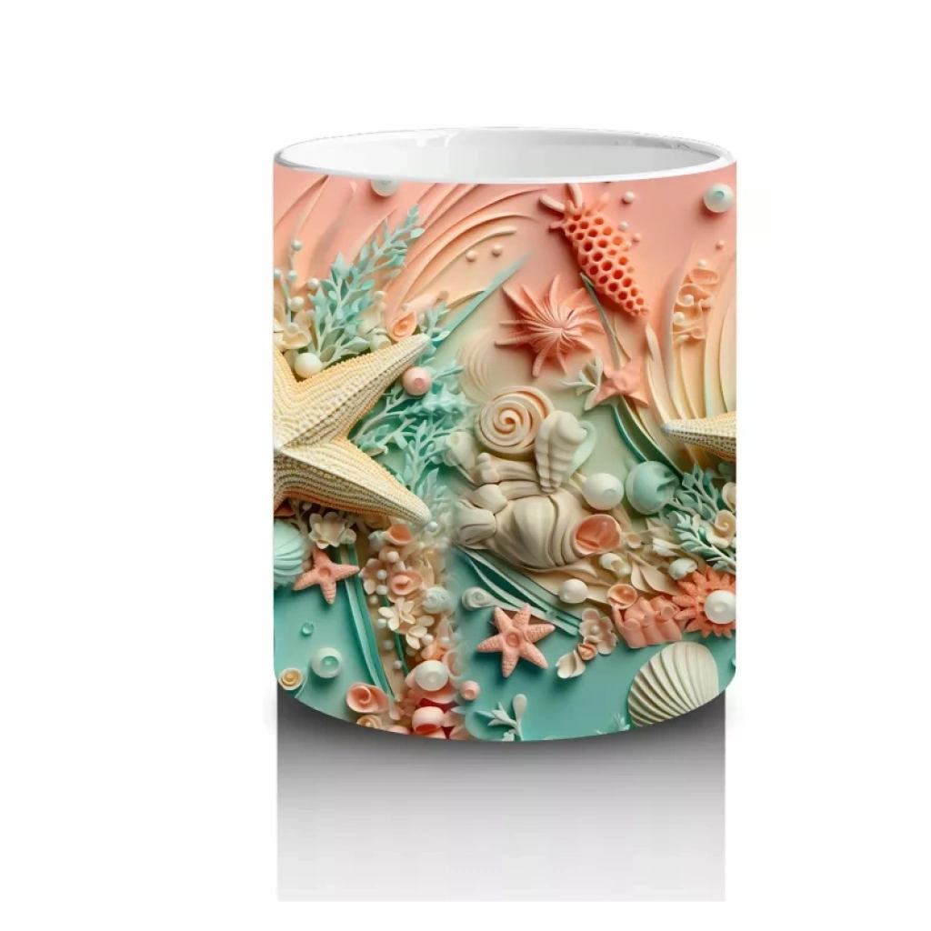 Tropik deniz kabukları ve yıldızlarla bezeli bu tasarım, yazın ferahlığını ve deniz kenarındaki huzuru kupanıza taşıyor. Tatil havasını evinde yaşamak isteyenler için ideal.