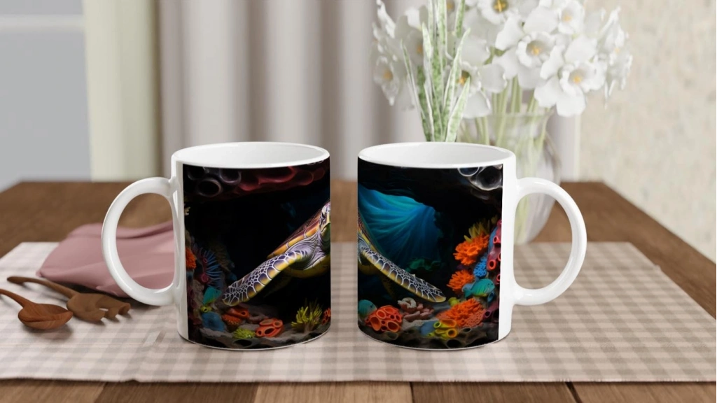 Renkli mercanlar ve kaplumbağa motifiyle tasarlanmış bu su altı temalı kupa bardak, doğanın zarafetini mutfağınıza taşıyor.