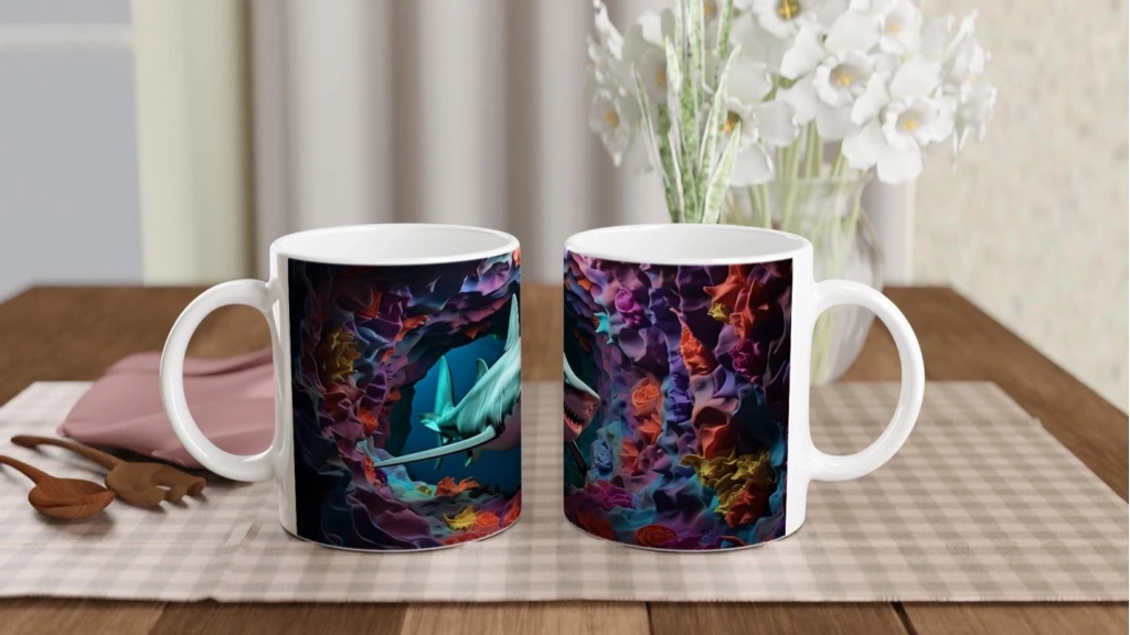 Yoğun renk kontrastları ve yumuşak geçişli mercan dokularıyla tasarlanan bu kupa bardak, hem sanatsal hem de tematik bir atmosfer sunuyor.