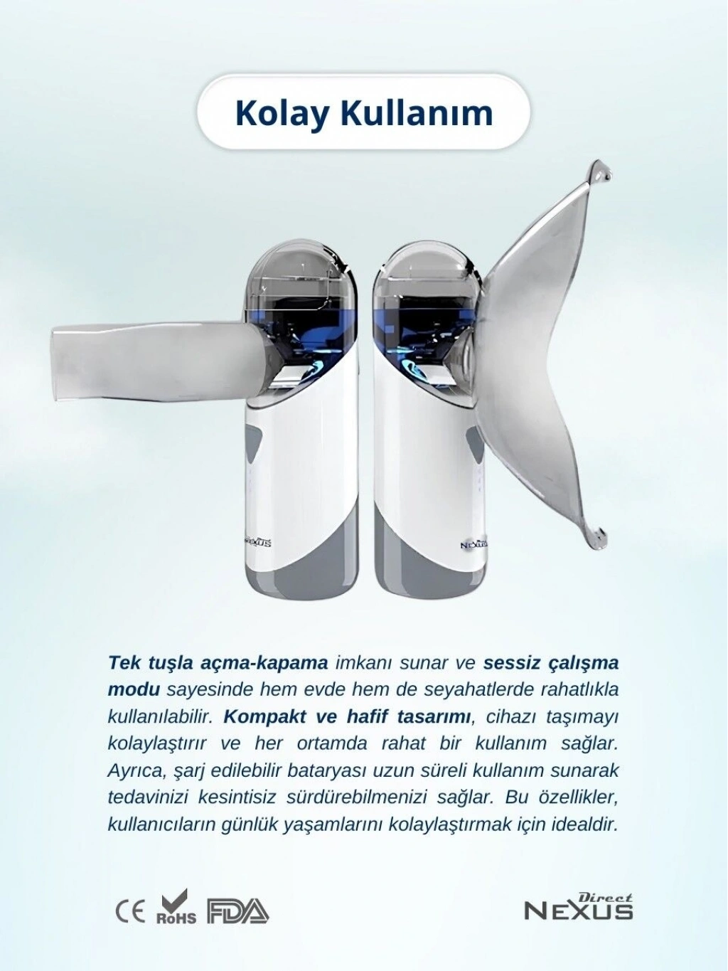Taşınabilir Nebulizatör özellikte olan ürün ayrıca kısa sürede pratik şarj edilme özelliğine de sahiptir!