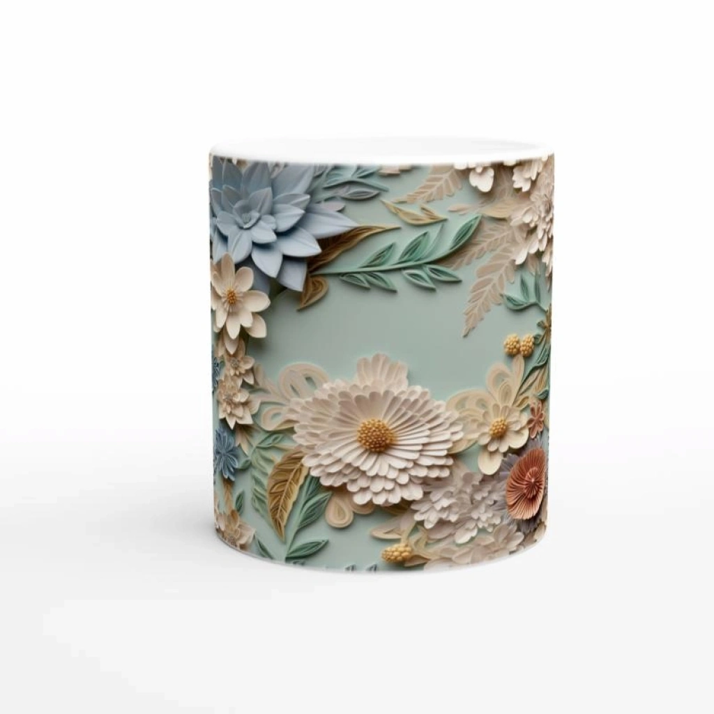 Nane yeşili arka plan üzerinde yükselen krem, açık mavi ve pastel turuncu tonlardaki rölyef çiçek desenleriyle bu kupa bardak, baharın tazeliğini ve doğallığını yansıtıyor. İnce işlenmiş yaprak motifl