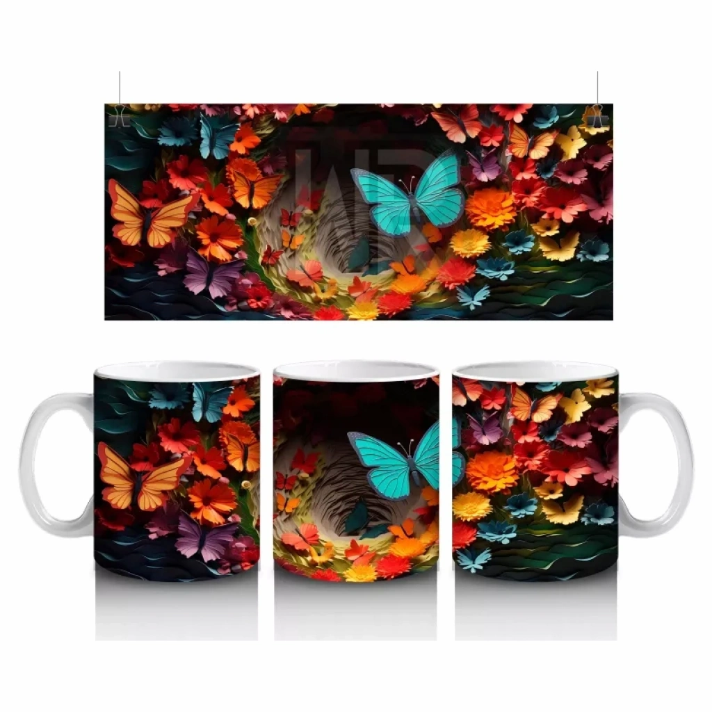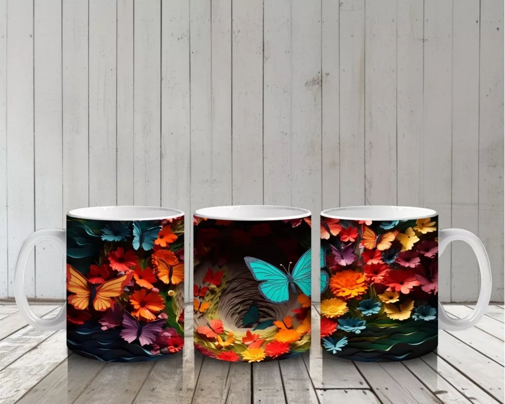 Doğal Çiçekler Arasında Turkuaz Kelebek – Baskılı Kahve Kupası