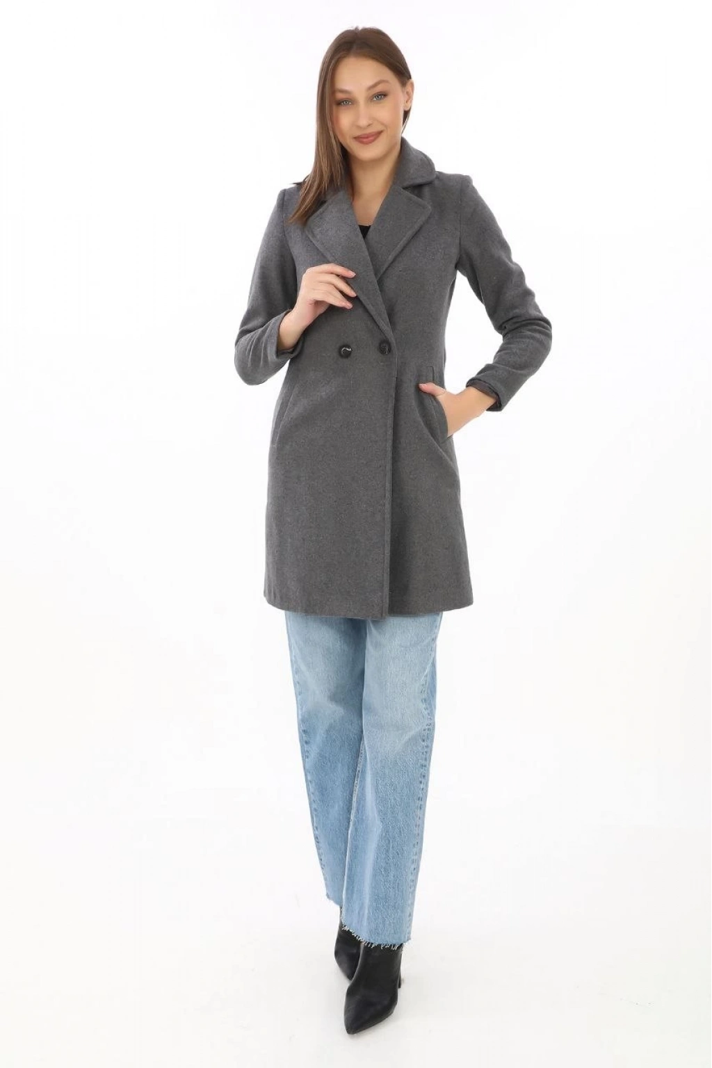 Düğmeli İçi Astarlı Kaşmir Kaşe Kaban - Füme