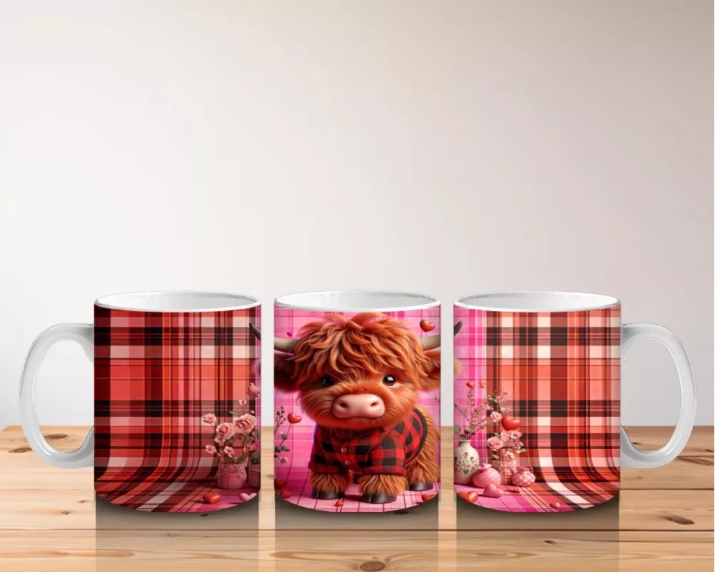 Ekose Zemin Üzerinde Kalpli Boynuzlu Sevimli İnek – Baskılı Kahve Kupası