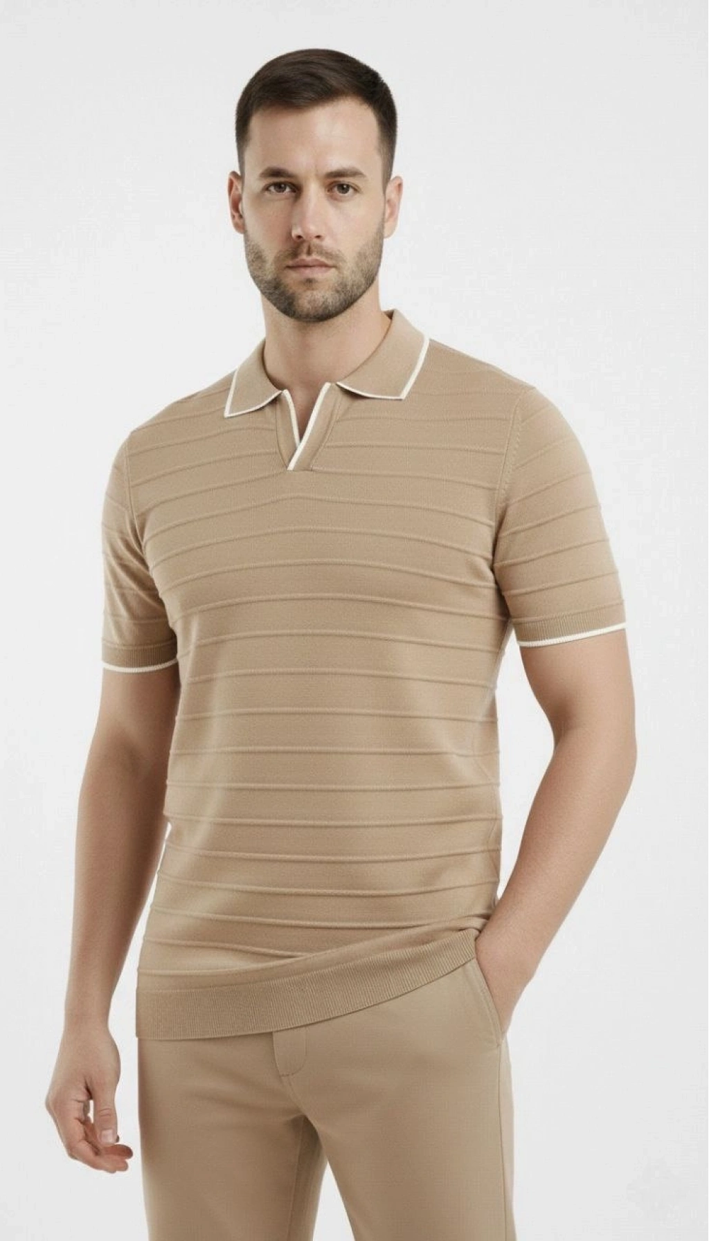 Erkek 3’lü Paket Triko Yakalı Düğmesiz Açık Yaka Fitilli Kısa Kollu Regular Fit Tişört - Bej, Beyaz, Mint Yeşili