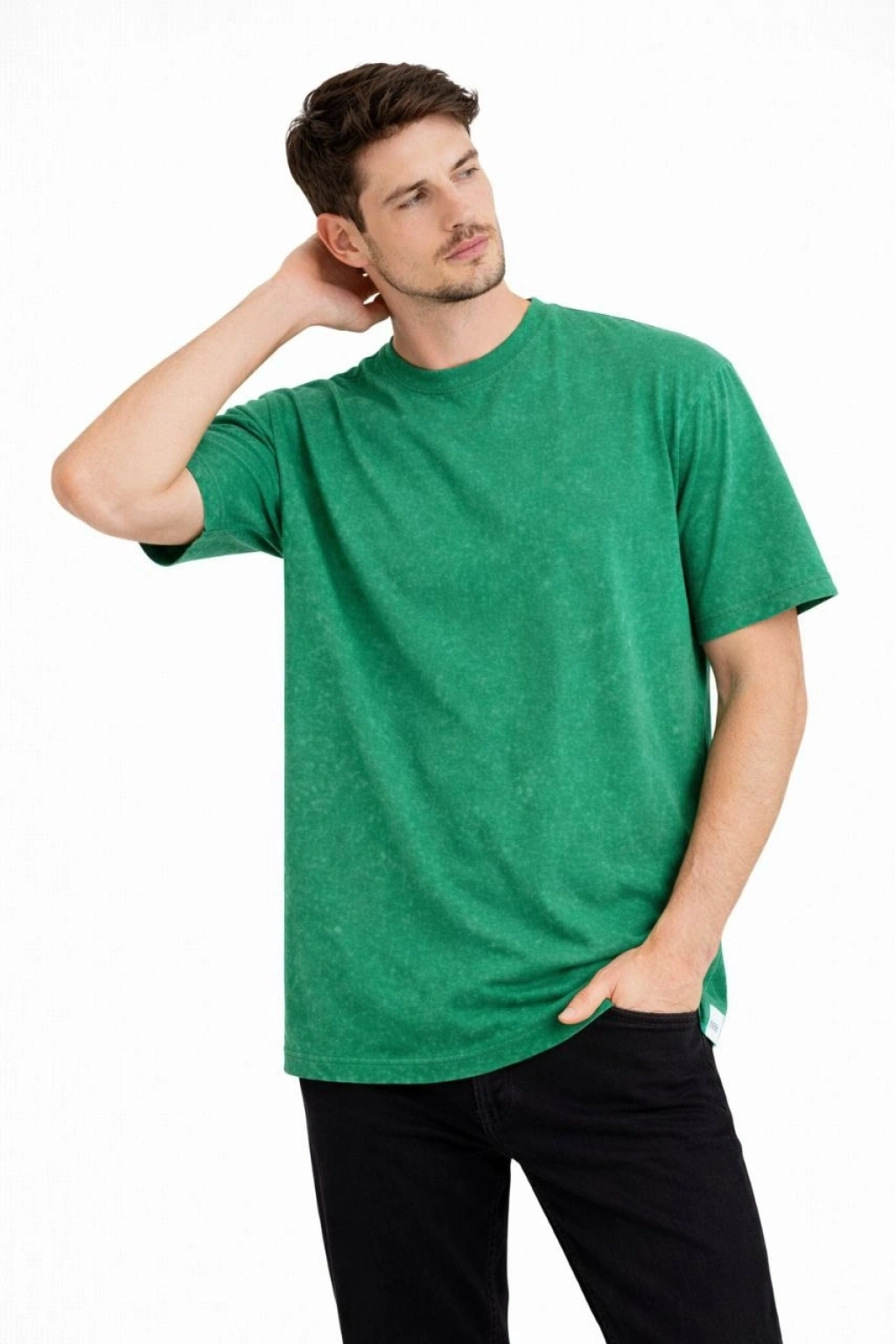 Erkek Asit Yıkama Bisiklet Yaka Kısa Kollu Oversize T-Shirt Tişört - Yeşil