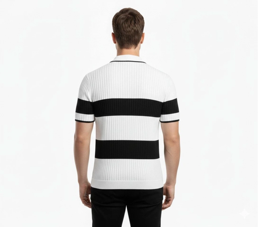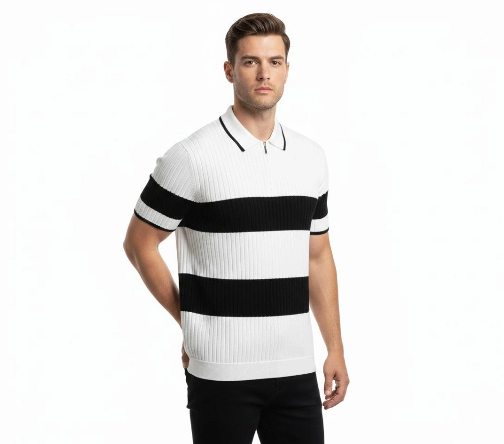 Erkek T-shirt Çizgili Triko Dokuma Kumaş Polo Yaka Yarım Fermuarlı Regular Kalıp Tişört - Beyaz