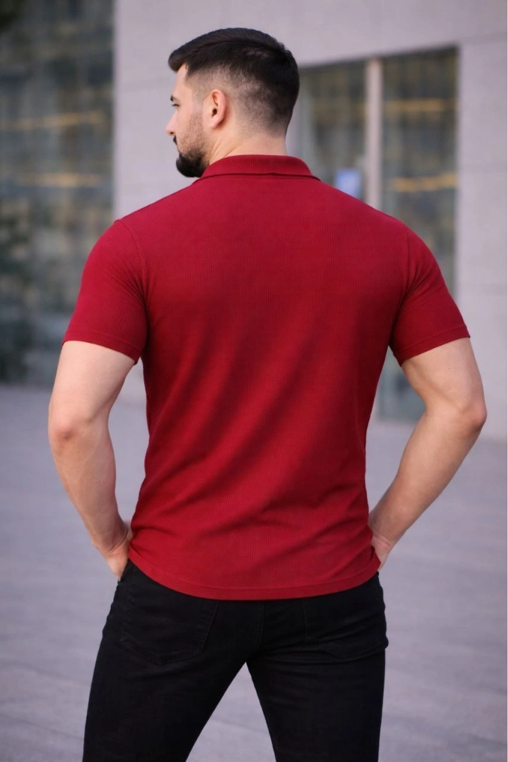 Erkek Waffle Kumaş Kısa Kollu Düğmeli Açık Yaka Regular Fit Gömlek - Kırmızı