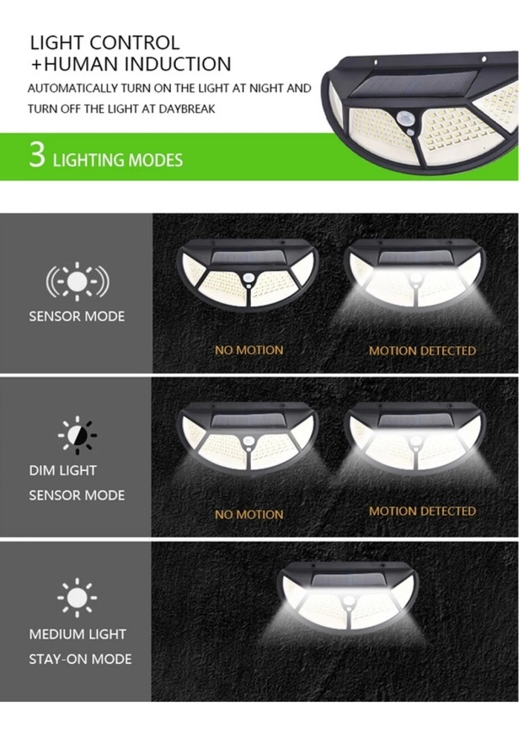 Fonksiyonel Sensörlü 102 Ledli Solar Bahçe LambasıBahçe balkon teras gibi dış mekanlarınız aydınlık ve dekoratif olması için güneş enerjili solar bahçe aydınlatma – solar lamba.Solar güneş enerjili bahçe aydınlatmanız sabahleyin güneş enerjisi ile kendini şarj eder , gece olunca sensörü sayesinde otomatik yanar.Balkonda , bahçede , pencerede , terasta kabloya gereksinim duymadan kolayca kullanabilirsiniz.Ürün Özellikleri;Malzeme: ABS plastikTipler: 102 LED (tip1)Hücre: Dahili 1*3.7V 1200mAh şarj edilebilir pilVoltaj: 220VGüçler: 10WIşık efekti: Hassas Işık Kontrolü+ PIR hareket sensörüIşık rengi: BeyazŞarj saatleri: 4-6 saatÇalışma saatleri: 8-10 saatSu direnci: IP65Algılama açısı: 120°Algılama mesafesi: 1-3  metreAydınlatma aralığı: 15㎡(tip1)Paket boyutu: 170*90*60mm/6.69*3.54*2.36inPaket ağırlığı: 169g/5.96ozPaket İçeriği;1 adet Solar Güneş Enerjili 102 Cob Ledli 3 Modlu Hareket Sensörlü Oval Bahçe Lambası