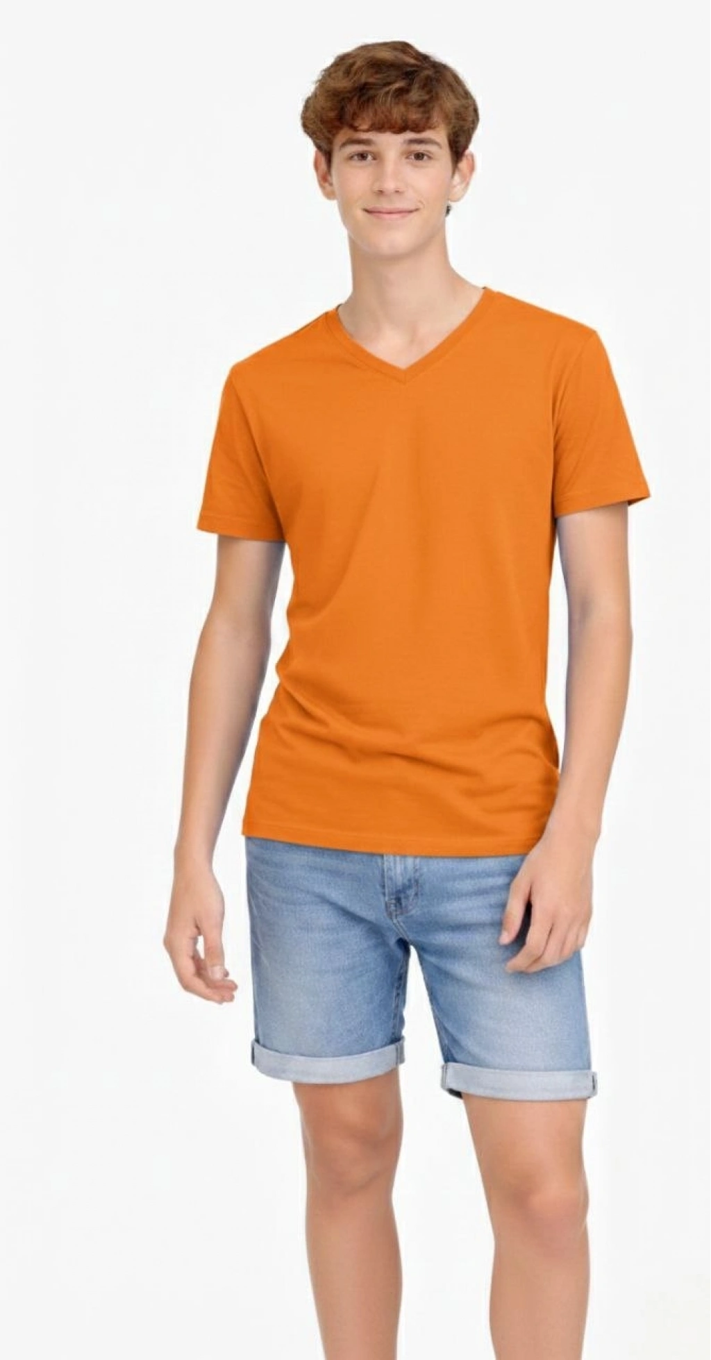 Genç Erkek Çocuk V Yaka Tişört Yazlık Model Günlük Basic Body - Turuncu