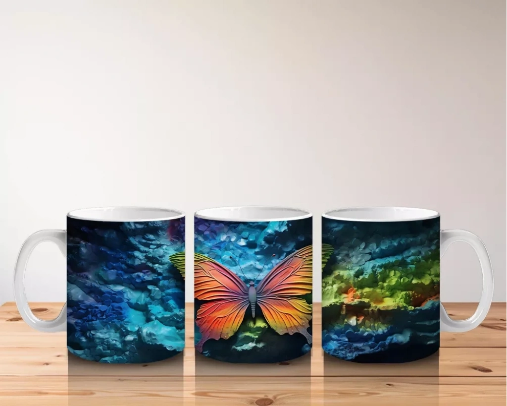 Gökyüzü Tonlarında Renkli Kanatlı Kelebek – Baskılı Kahve Kupası