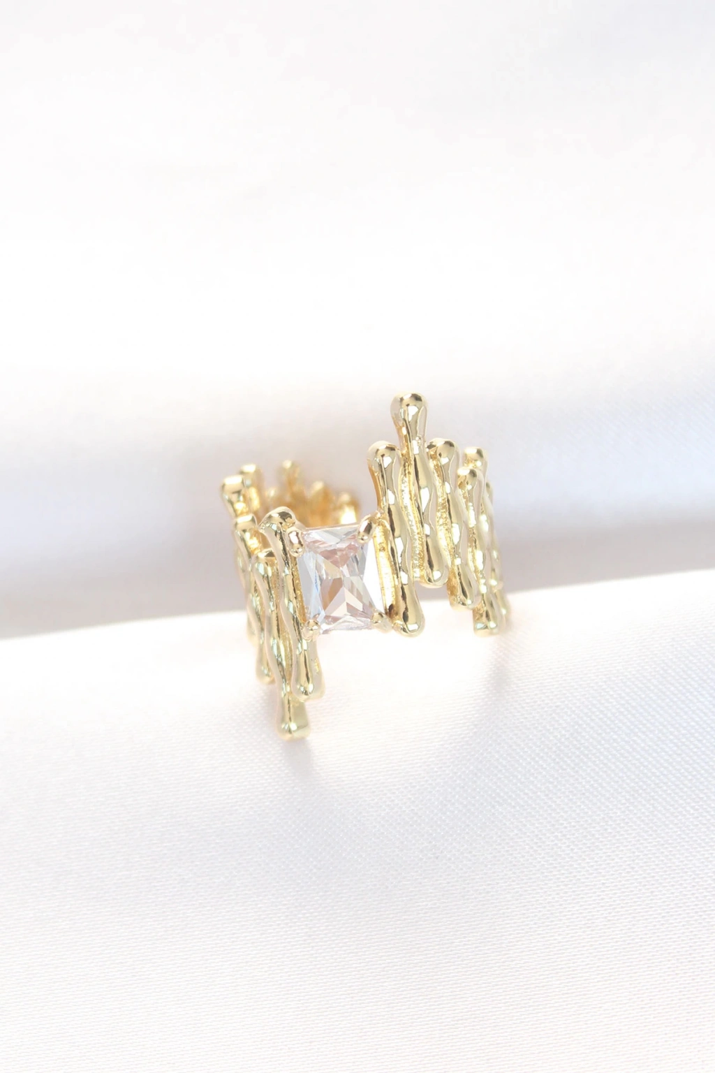 Gold Renk Tırtıklı Kalın Baget Taş Tasarım Ayarlanabilir Yüzük