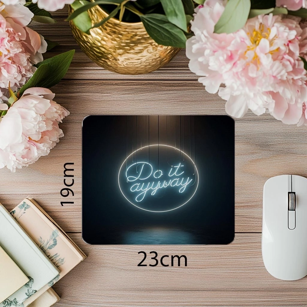 Görünmez askıdan sarkan neon yazı efektiyle tasarlanan bu mousepad, modern illüzyon hissi ve şık bir minimalizm sunar.