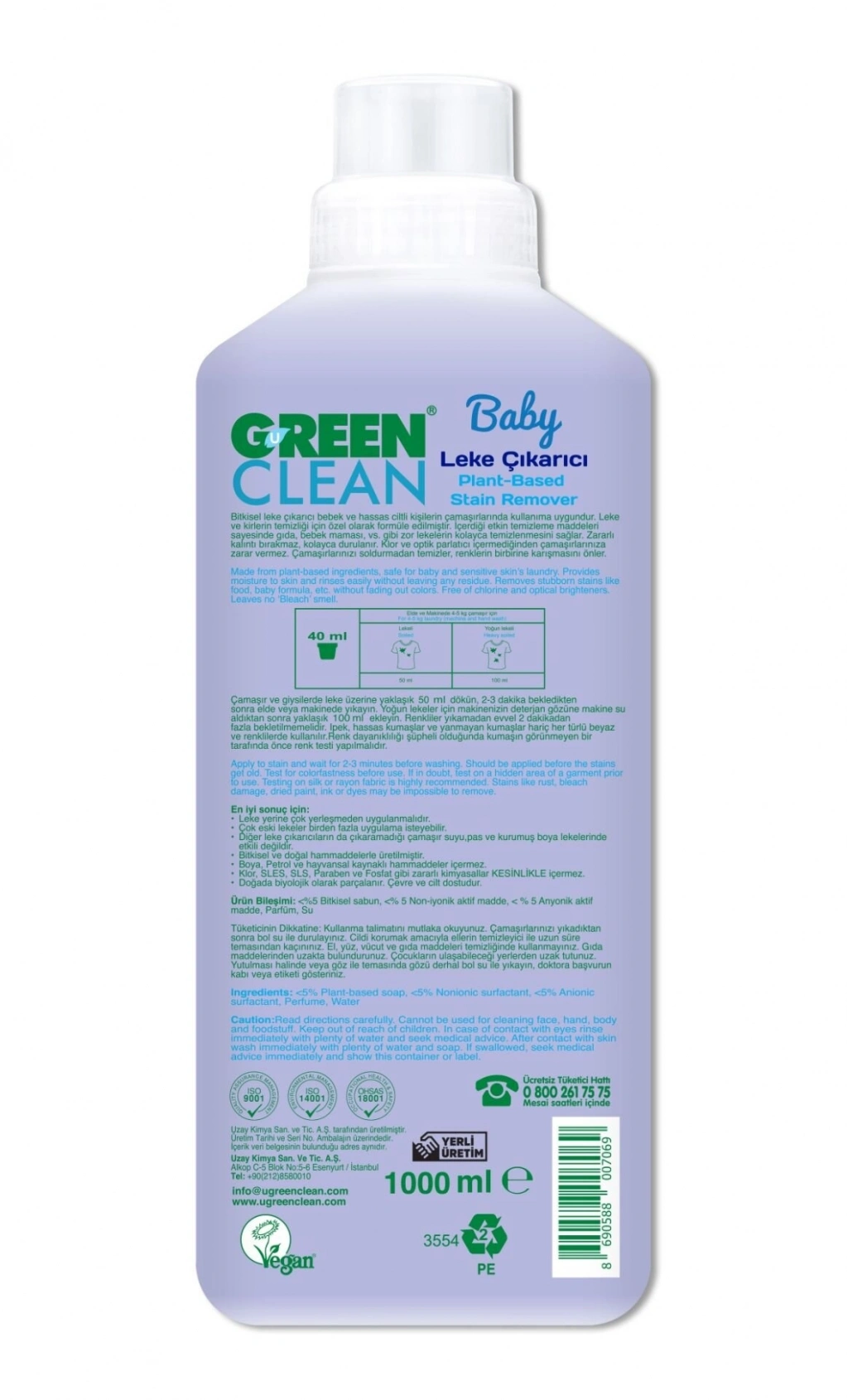 U Green Clean Baby Bitkisel Leke Çıkarıcı, bebek ve hassas ciltli kişilerin çamaşırlarında kullanıma uygundur.