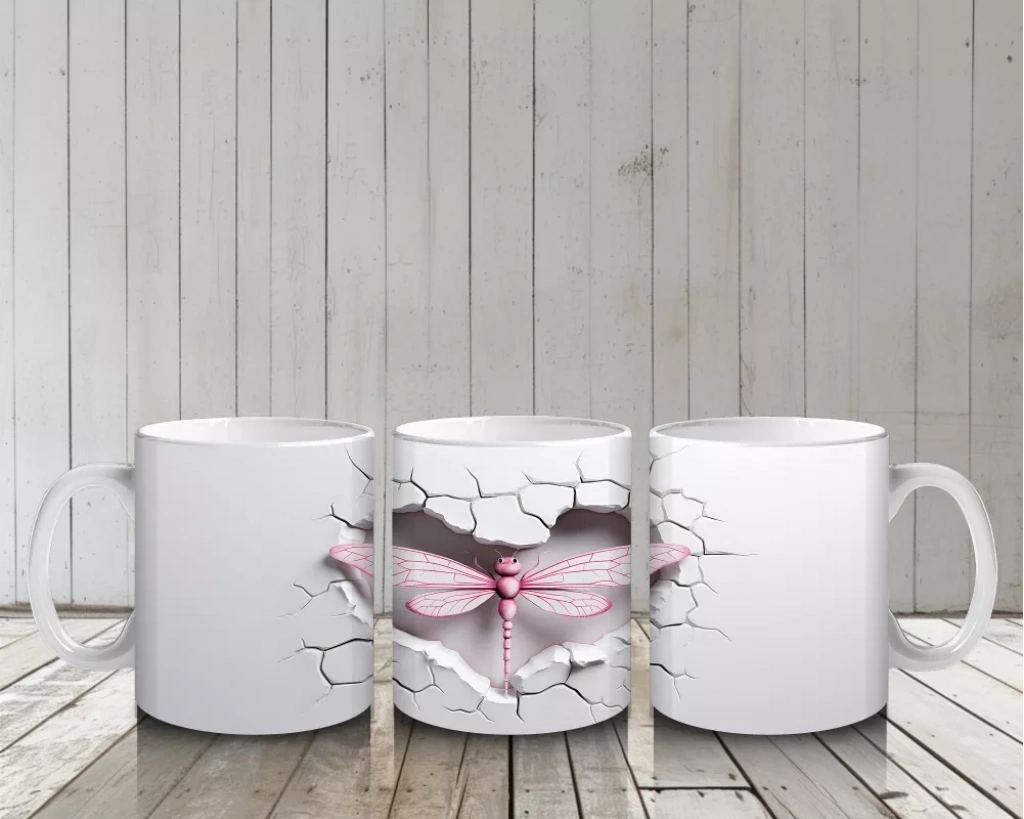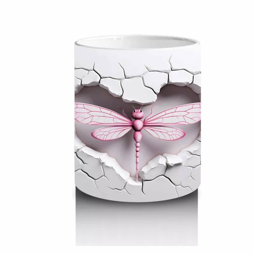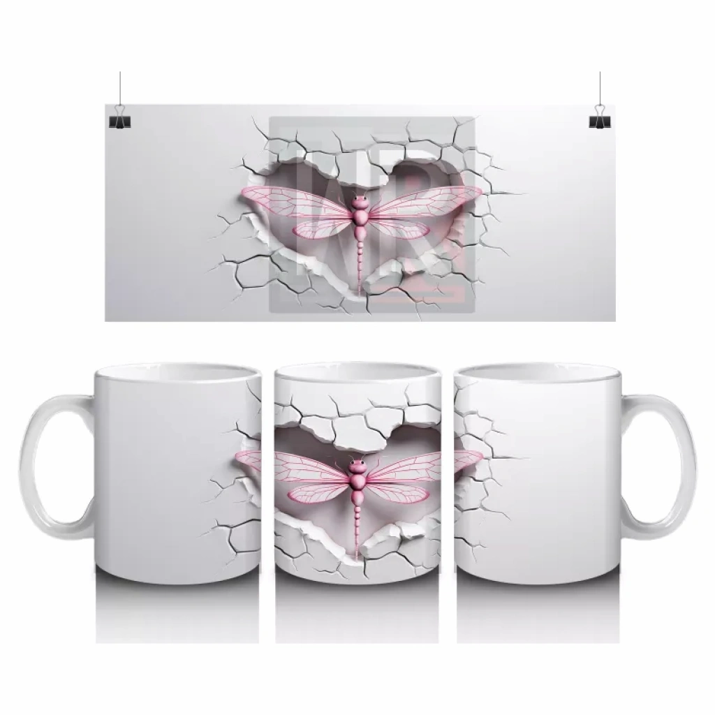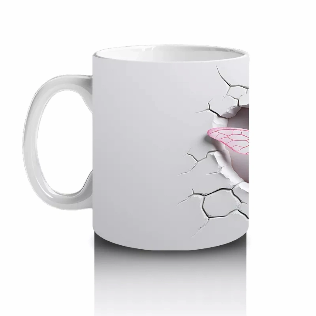 Gri Çatlak Zemin Üzerinde Zarif Pembe Kanatlı Yusufçuk – Baskılı Kahve Kupası