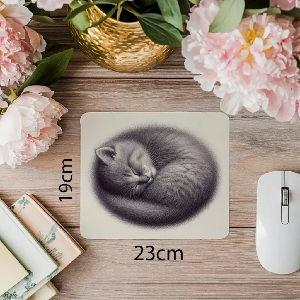 Gri zeminli yatmış kedi mouse pad ile masanda huzur ve sakinlik yarat! Zarif tasarım ve konforlu yüzeyiyle oyun ve çalışma keyfini artır.