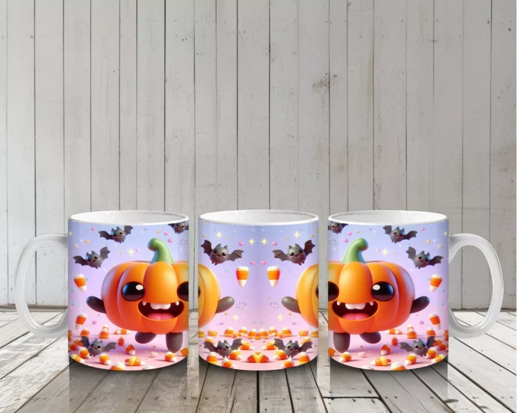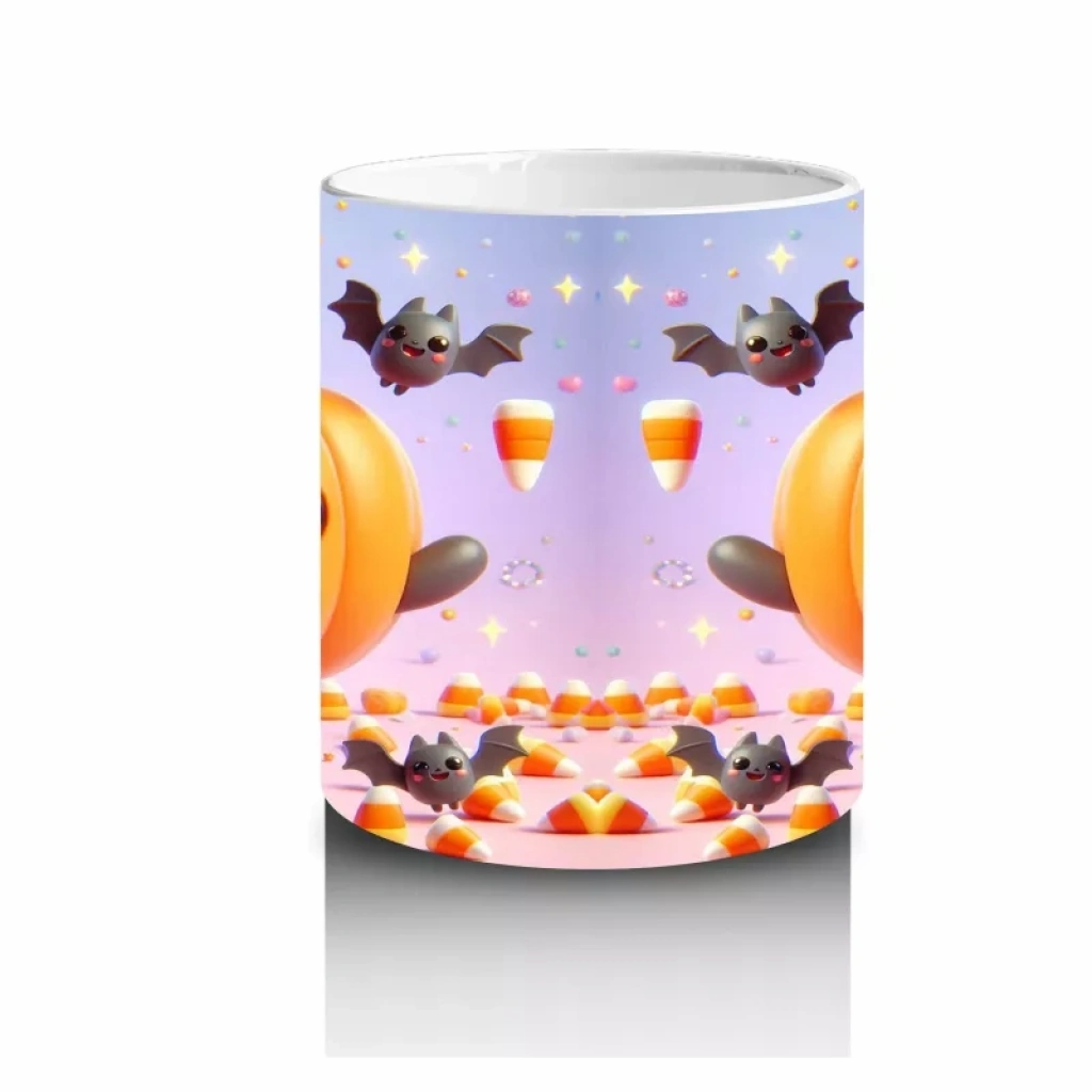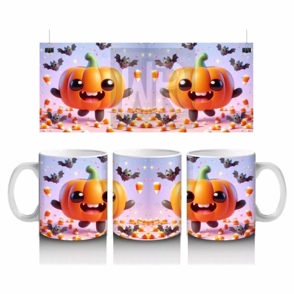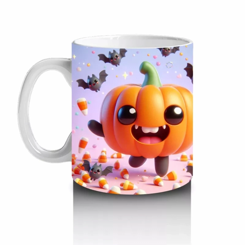 Gülen balkabakları ve yarasa figürleriyle süslenmiş bu renkli kupa, Halloween ruhunu neşeli ve enerjik bir şekilde yansıtır.