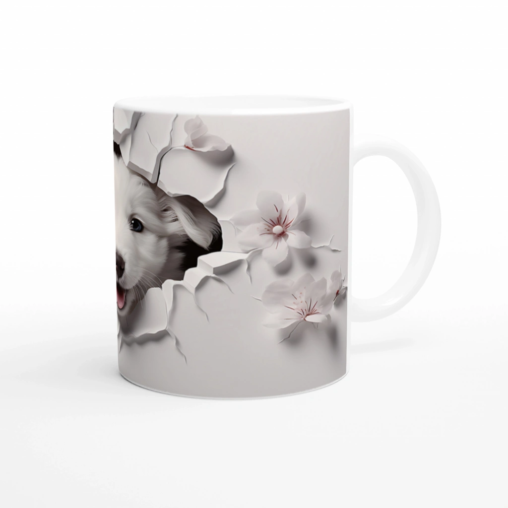 Gülümseyen Beyaz Yavru Köpek ve Kiraz Çiçekleri Baskılı Kupa Bardak, hem sevimliliğiyle gülümsetiyor hem de zarif detaylarıyla her ortama uyum sağlıyor.