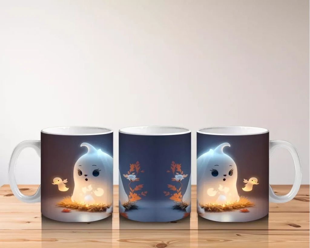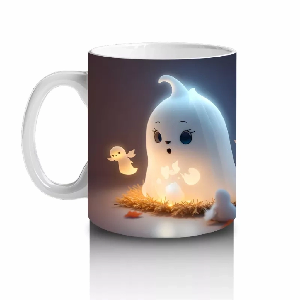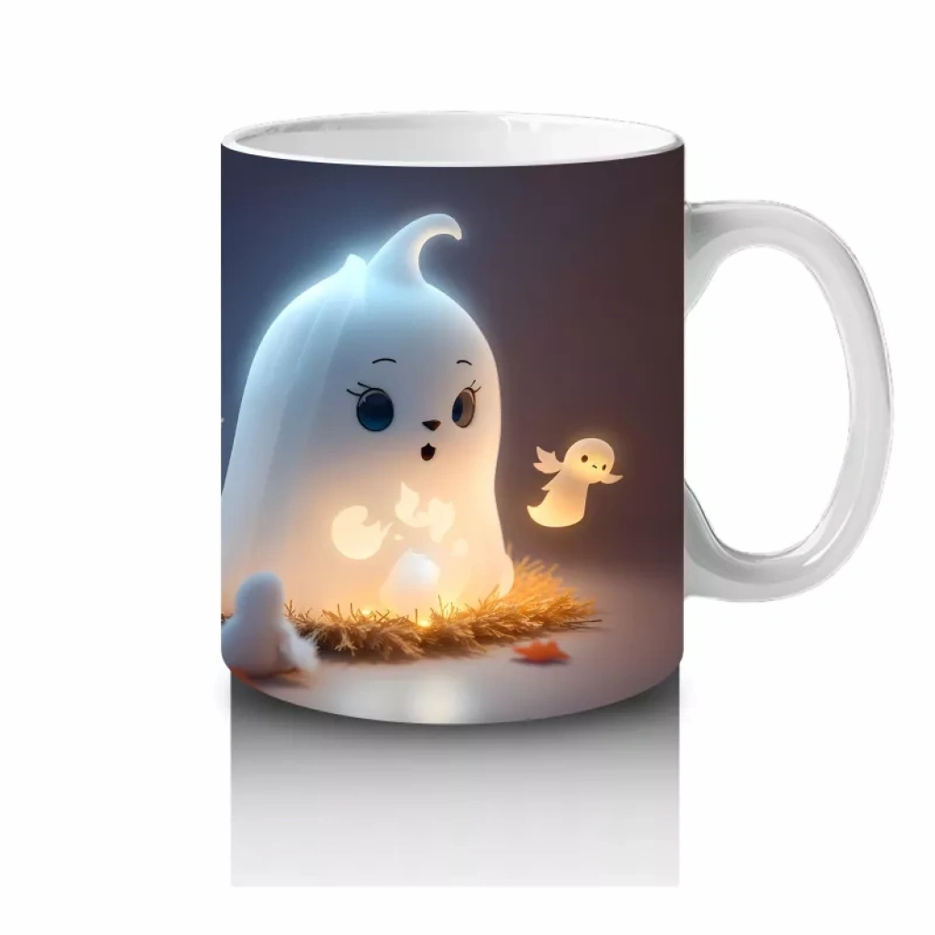 Gülümseyen Hayalet ve Sıcak Işıklar – Hediyelik Kahve Kupası Sıcak ışıklar eşliğinde gülümseyen sevimli hayalet tasarımıyla bu Cadılar Bayramı baskılı kupa, hem neşeli hem nostaljik bir atmosfer sunar. Şık bir hediyelik kahve kupası arayanlara özel.