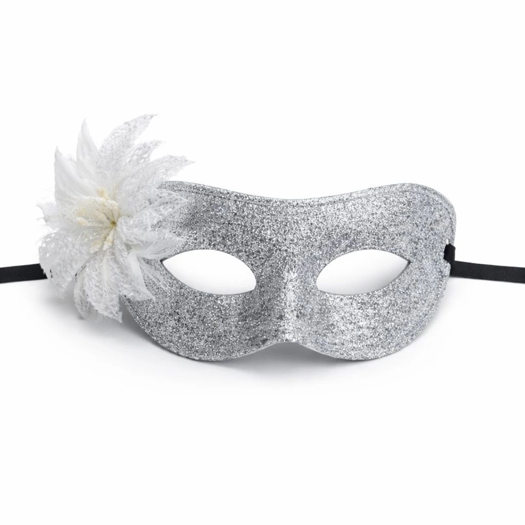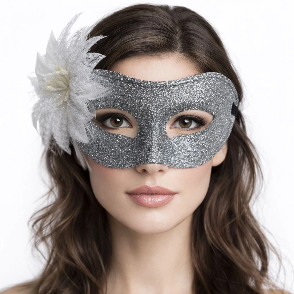 Maskeli partilerde fark yaratmak isteyenler için tasarlanan gümüş simli tüylü kadın balo maskesi, zarif Venedik stilini modern glitter dokunuşuyla birleştirir.
