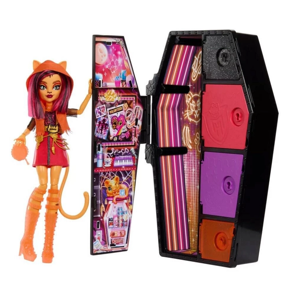 - Toralei Stripe bebeği cesur renkli saçları ve makyajıyla kendini ifade ediyor. Kolay saklama ve hareket halindeyken taşınabilirlik için onu ve tüm Neon Korkularını tabut şeklindeki dolabın içine koyun.