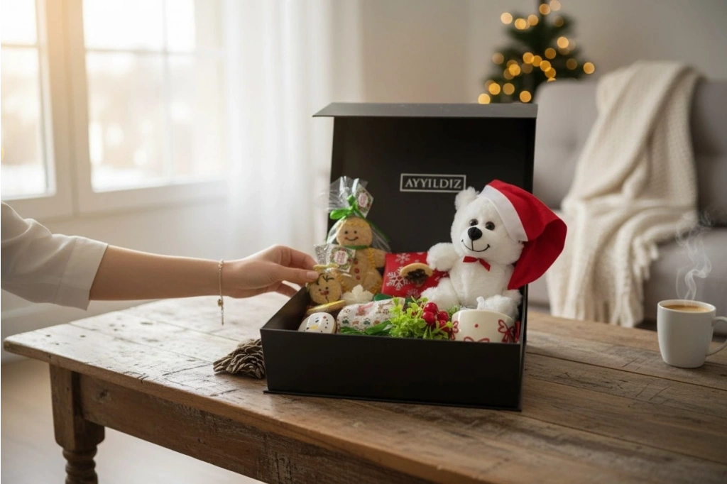 Yılbaşı temasına uygun olarak tasarlanmış kutu, sevdiklerinize sıcak bir yeni yıl hediyesi sunmanın en şık yollarından biridir. İçeriğindeki enfes çikolatalar ile tatlı bir sürpriz yaparken, peluş oyuncak da sevginizi en yumuşak şekilde ifade eder.