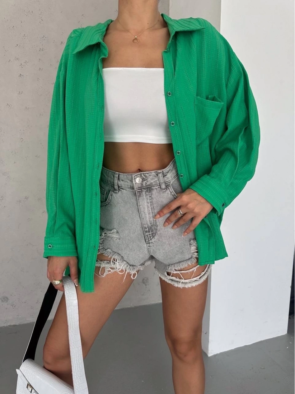 ÇOK SATAN marka ağaç kabuğu desenli oversize gömlek, şıklık ve rahatlığı bir arada sunuyor.