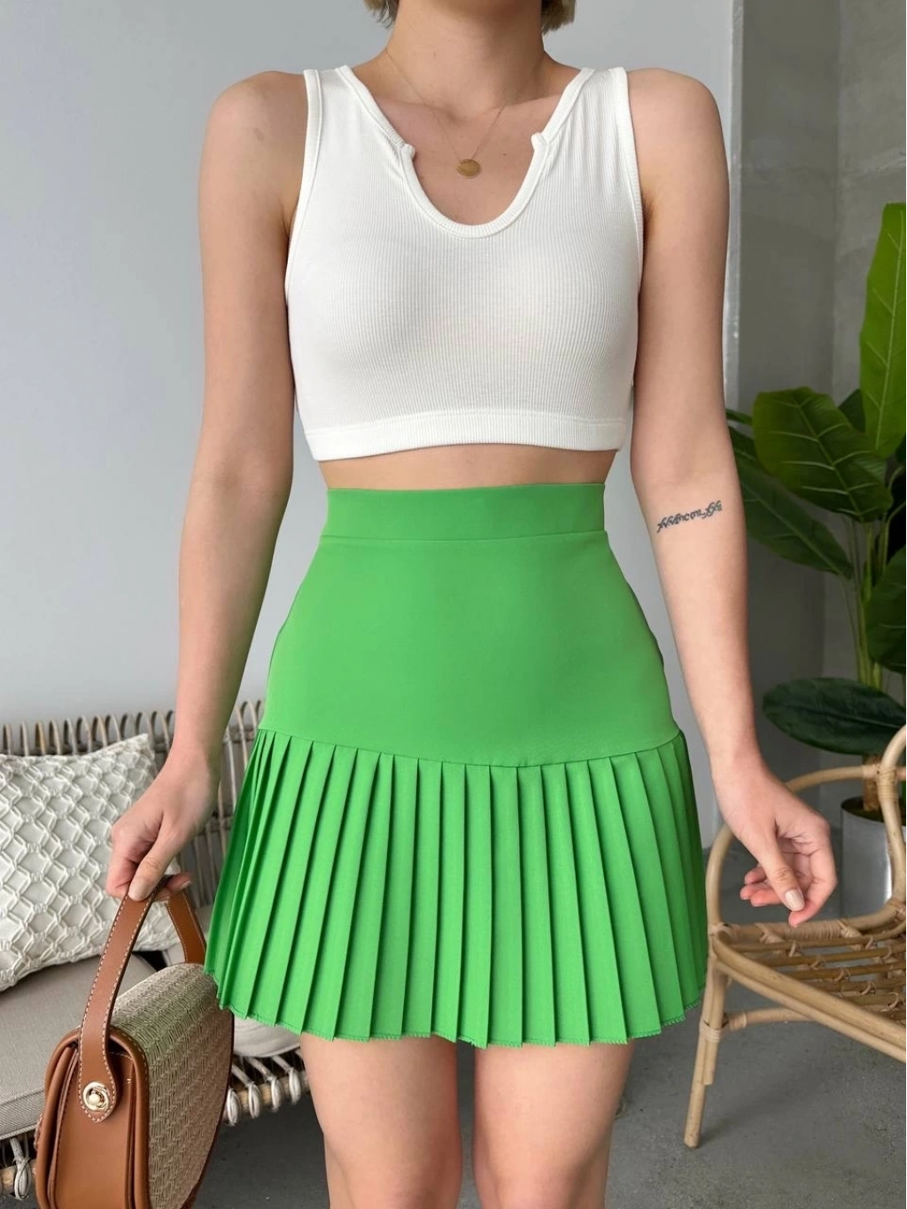 Altı pliseli mini etek yeşil s24705, şıklığı ve rahatlığı bir arada sunar.